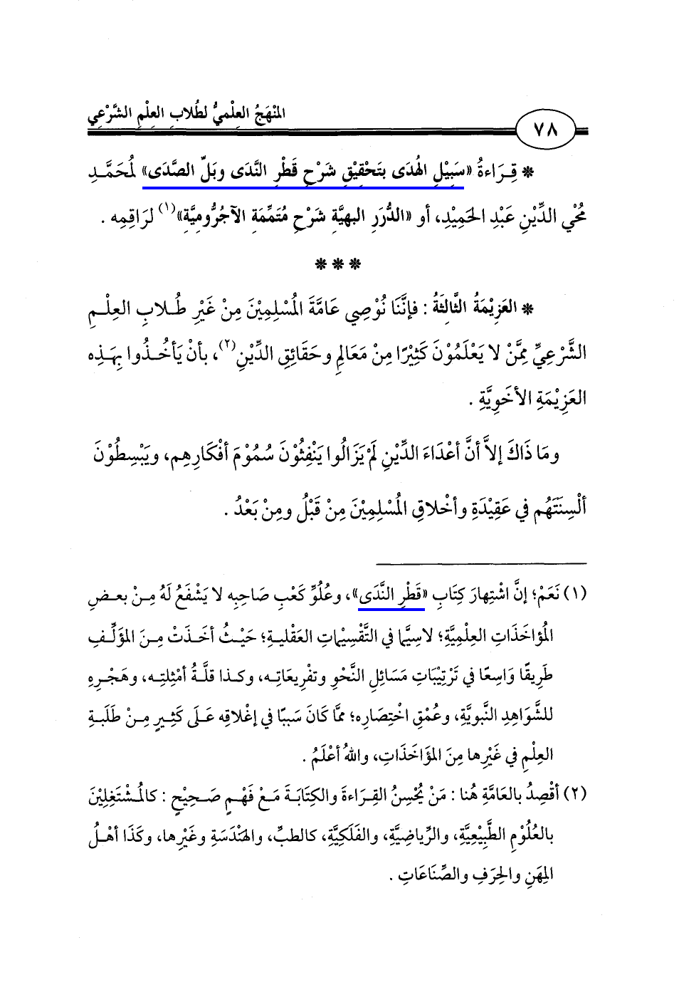 * قِرَاءةُ "سَبِيلِ الهُدَى بتَحْقِيقِ شَرْع قَطْرِ النَّدَى وبَلّ الصَّدَى" لمُحَمَّدِ مُحْيي الدِّينِ عَبْدِ الحمِيدِ، أو "الدُّرَرِ البهيَّةِ شَرْح مُتَمِّمَةِ الآجُرُّومِيَّةِ" (¬1) لرَاقِمِه.