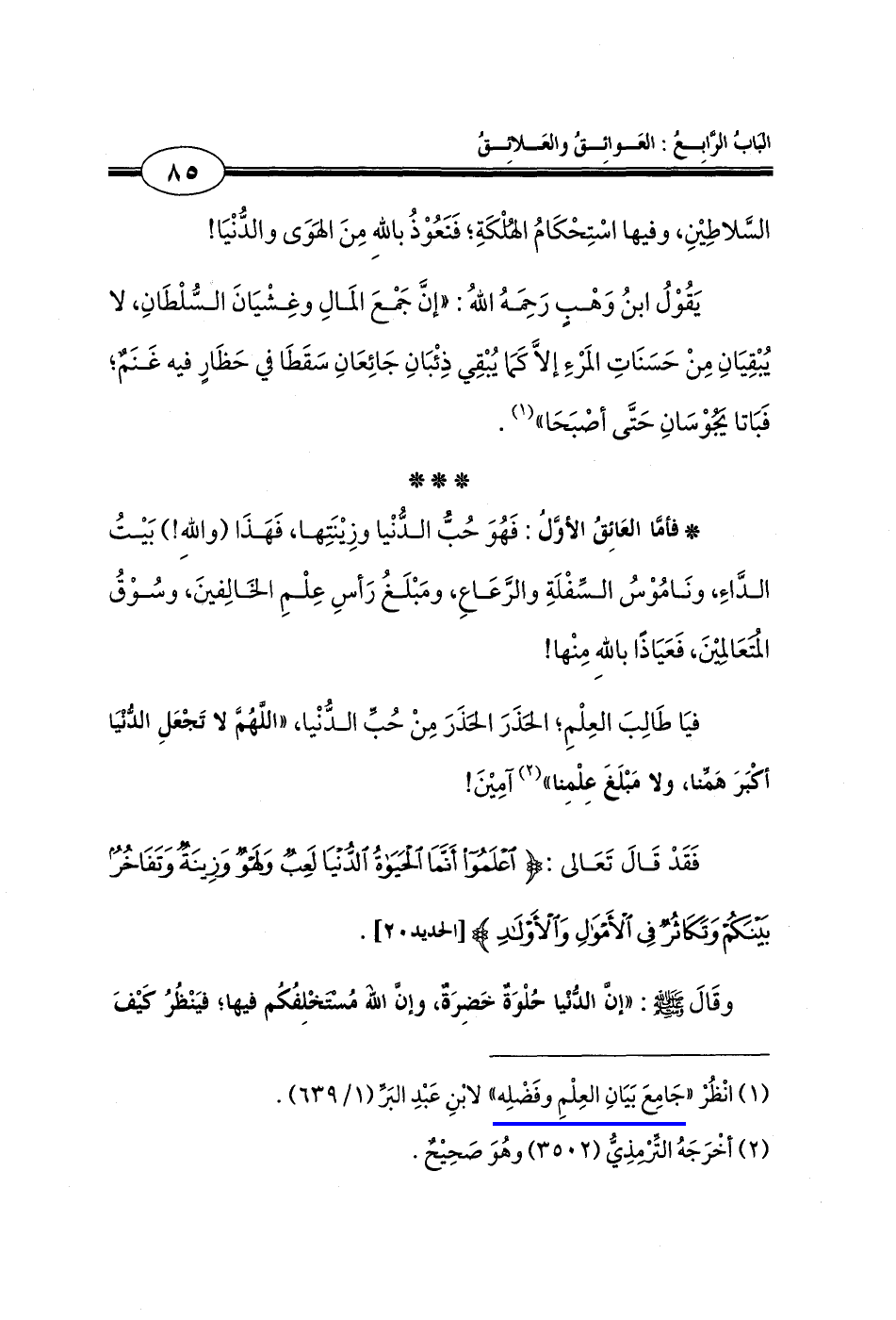 * فأمَّا العَائِقُ الأوَّلُ: فَهُوَ حُبُّ الدُّنْيا وزِينَتِها، فَهَذَا (واللهِ!) بَيتُ الدَّاءِ، ونَامُوْسُ السِّفْلَةِ والرَّعَاعِ، ومَبْلَغُ رَأسِ عِلْمِ الخَالِفينَ، وسُوْقُ المُتعَالِمينَ، فَعَيَاذًا باللهِ مِنْها!