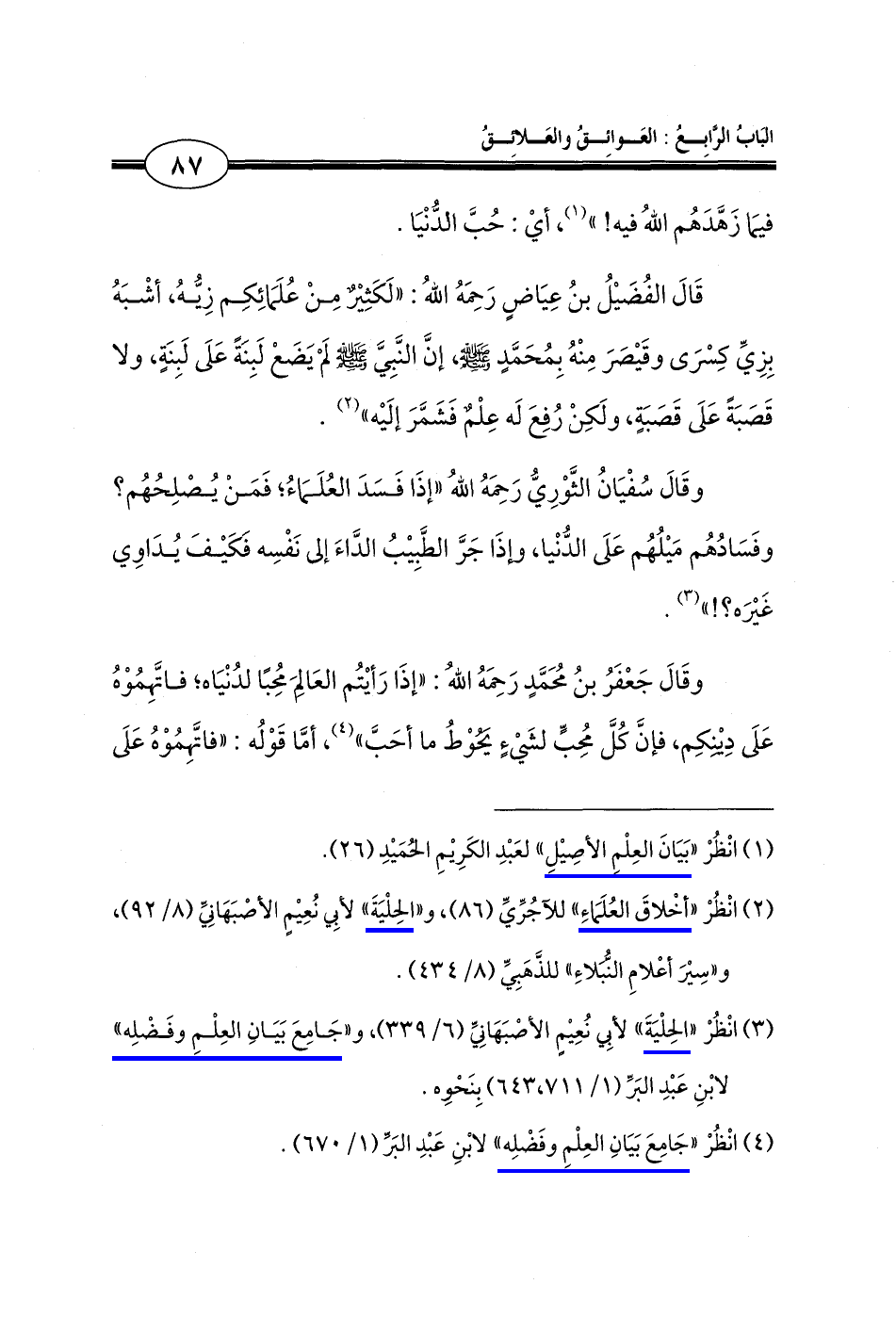 (¬2) انْظُرْ "أخْلاقَ العُلَمَاءِ" للآجُرِّيِّ (86)، و"الحِلْيَةَ" لأبِي نُعِيمٍ الأصْبَهَانِيِّ (8/ 92)، و"سِيرَ أعْلامِ النُّبَلاءِ" للذَّهَبِيِّ (8/ 434).