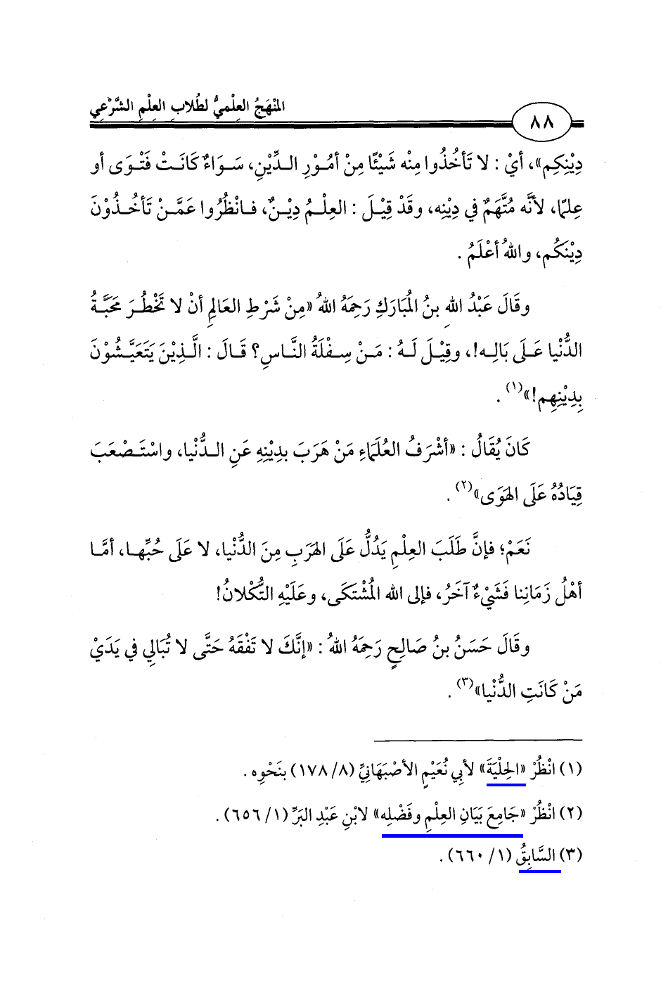 وقَالَ عَبْدُ اللهِ بنُ المُبَارَكِ رَحِمَهُ اللهُ "مِنْ شَرْطِ العَالمِ أنْ لا تَخْطُرَ محَبَّةُ الدُّنْيا عَلَى بَالِه!، وقِيلَ لَهُ: مَنْ سِفْلَةُ النَّاسِ؟ قَالَ: الَّذِينَ يَتَعَيَّشُوْنَ بِدِينِهِم! " (¬1).