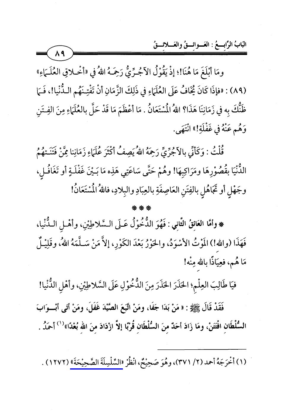 * وأمَّا العَائِقُ الثَّانِي: فَهُوَ الدُّخُوْلُ عَلَى السَّلاطِينِ، وأهْلِ الدُّنْيا، فَهَذَا (واللهِ!) المَوْتُ الأسْوَدُ، والحَوْرُ بَعْدَ الكَوْرِ، إلَّا مَنْ سَلَّمَهُ اللهُ، وقَلِيلٌ مَا هُم، فعِيَاذًا باللهِ مِنْه!