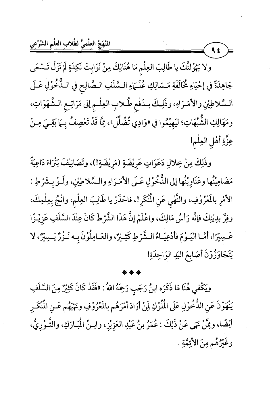 ولا يَهُوْلنَّكَ يا طَالِبَ العِلْمِ مَا هُنَالِكَ مِنْ نَوَابِتَ نكدَةٍ لَم تَزَلْ تَسْعَى جَاهِدَةً في إحْيَاءِ مُخَالَفَةِ مَسَالِكِ عُلَمَاءِ السَّلَفِ الصَّالِحِ في الدُّخُوْلِ عَلَى السَّلاطِينِ والأمَرَاءِ، وذَلِكَ بدَفْعِ طُلابِ العِلْمِ إلى مَرَاتِعِ الشَّهَوَاتِ، ومَهَالِكِ الشُّبُهَاتِ؛ ليَهِيمُوا في "وَادِي تُضُلِّلَ"، مِمَّا قَدْ تَعْصِفُ بِمَا بَقِيَ مِنْ عِزَّةِ أهْلِ العِلْمِ!