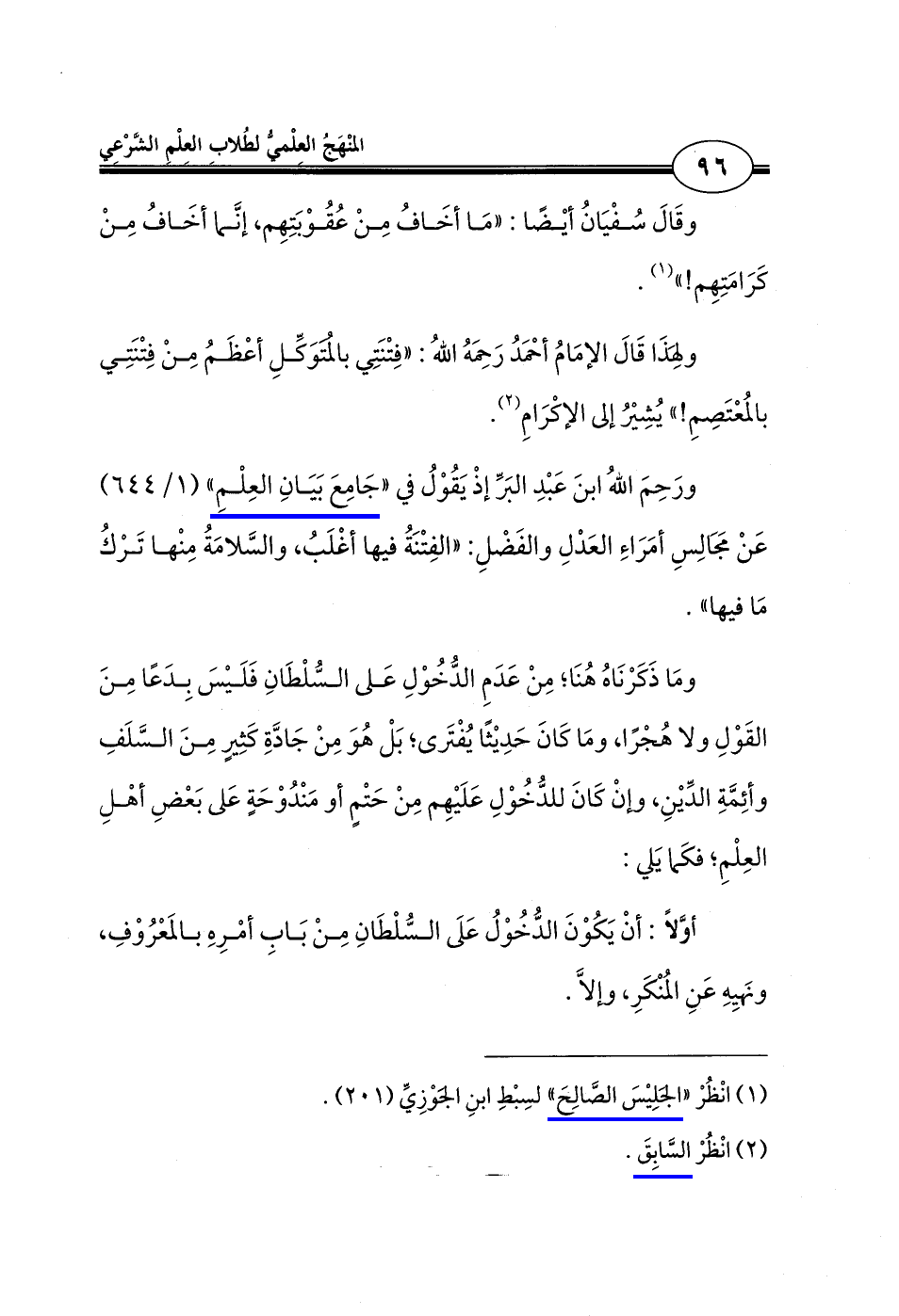 ورَحِمَ اللهُ ابنَ عَبْدِ البَرِّ إذْ يَقُوْلُ في "جَامِعَ بَيَانِ العِلْمِ" (1/ 644) عَنْ مَجَالِسِ أمَرَاءِ العَدْلِ والفَضْلِ: "الفِتْنَةُ فيها أغْلَبُ، والسَّلامَةُ مِنْها تَرْكُ مَا فيها".