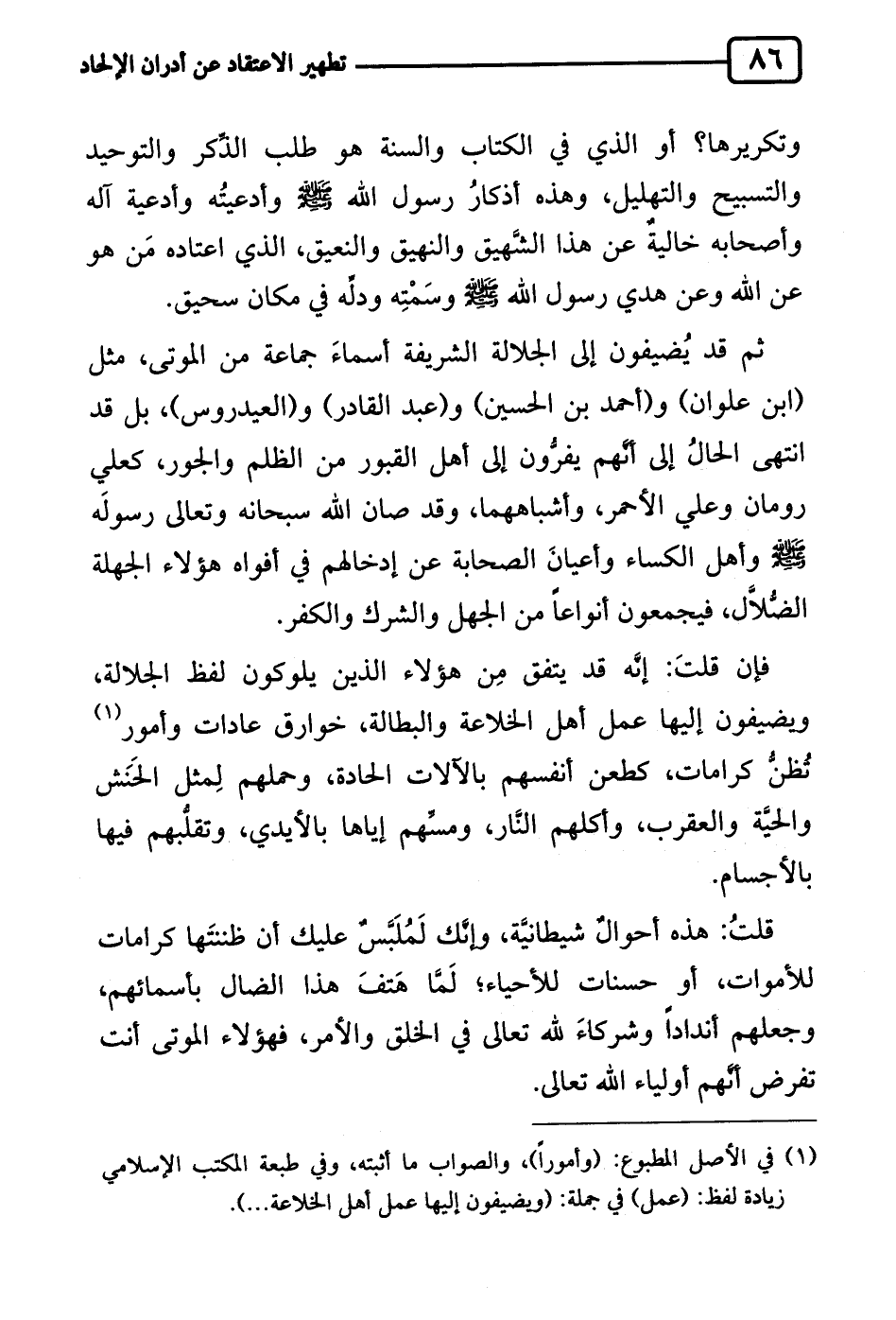 ثم قد يُضيفون إلى الجلالة الشريفة أسماءَ جماعة من الموتى، مثل (ابن علوان) و (أحمد بن الحسين) و (عبد القادر) و (العيدروس) ، بل قد انتهى الحالُ إلى أنَّهم يفرُّون إلى أهل القبور من الظلم والجور، كعلي رومان وعلي الأحمر، وأشباههما، وقد صان الله سبحانه وتعالى رسولَه صلى الله عليه وسلم وأهل الكساء وأعيانَ الصحابة عن إدخالهم في أفواه هؤلاء الجهلة الضُّلاَّل، فيجمعون أنواعاً من الجهل والشرك والكفر.