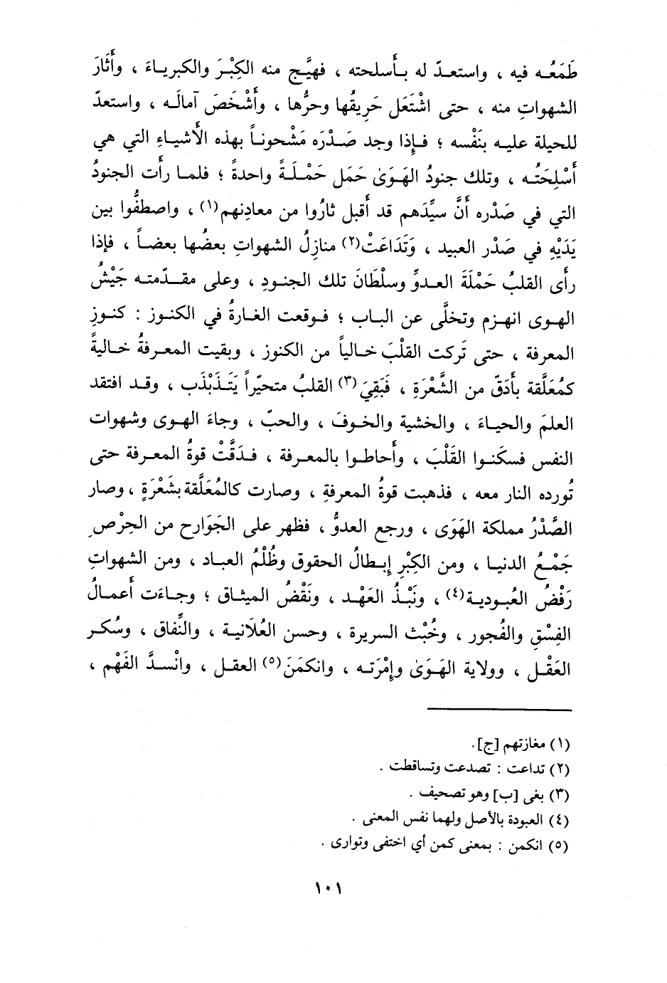 طمعه فِيهِ واستعد لَهُ بأسلحته فهيج مِنْهُ الْكبر والكبرياء وأثار الشَّهَوَات مِنْهُ حَتَّى اشتعل حريقها وحرها وأشخص آماله واستعد للحيلة عَلَيْهِ بِنَفسِهِ فَإِذا وجد صَدره مشحونا بِهَذِهِ الْأَشْيَاء الَّتِي هِيَ أسلحته وَتلك جنود الْهوى حمل حَملَة وَاحِدَة فَلَمَّا رَأَتْ الْجنُود الَّتِي فِي صَدره أَن سيدهم قد أقبل ثَارُوا من معادنهم وَاصْطَفُّوا بَين يَدَيْهِ فِي صدر العبيد وتداعت منَازِل الشَّهَوَات بَعْضهَا بَعْضًا فَإِذا رأى الْقلب حَملَة الْعَدو وسلطان تِلْكَ الْجنُود وعَلى مقدمته جَيش الْهوى انهزم وتخلى عَن الْبَاب فَوَقَعت الْغَارة فِي الْكُنُوز كنوز الْمعرفَة حَتَّى تركت الْقلب خَالِيا من الْكُنُوز وَبقيت الْمعرفَة خَالِيَة كمعلقة بأدق من الشعرة فَبَقيَ الْقلب متحيرا يتذبذب وَقد افْتقدَ الْعلم وَالْحيَاء والخشية وَالْخَوْف وَالْحب وَجَاء الْهوى وشهوات النَّفس فسكنوا الْقلب وَأَحَاطُوا بالمعرفة فدقت قُوَّة الْمعرفَة حَتَّى تورده النَّار مَعَه فَذَهَبت قُوَّة الْمعرفَة وَصَارَت كالمعلقة بشعرة وَصَارَ الصَّدْر مملكة الْهوى وَرجع الْعَدو فَظهر على الْجَوَارِح من الْحِرْص جمع الدُّنْيَا وَمن الْكبر إبِْطَال الْحُقُوق وظلم الْعباد وَمن الشَّهَوَات رفض الْعُبُودِيَّة ونبذ الْعَهْد وَنقض الْمِيثَاق وَجَاءَت أَعمال الْفسق والفجور وخبث السريرة وَحسن الْعَلَانِيَة والنفاق وسكر الْعقل وَولَايَة الْهوى وإمرته وانكمن الْعقل وانسد الْفَهم