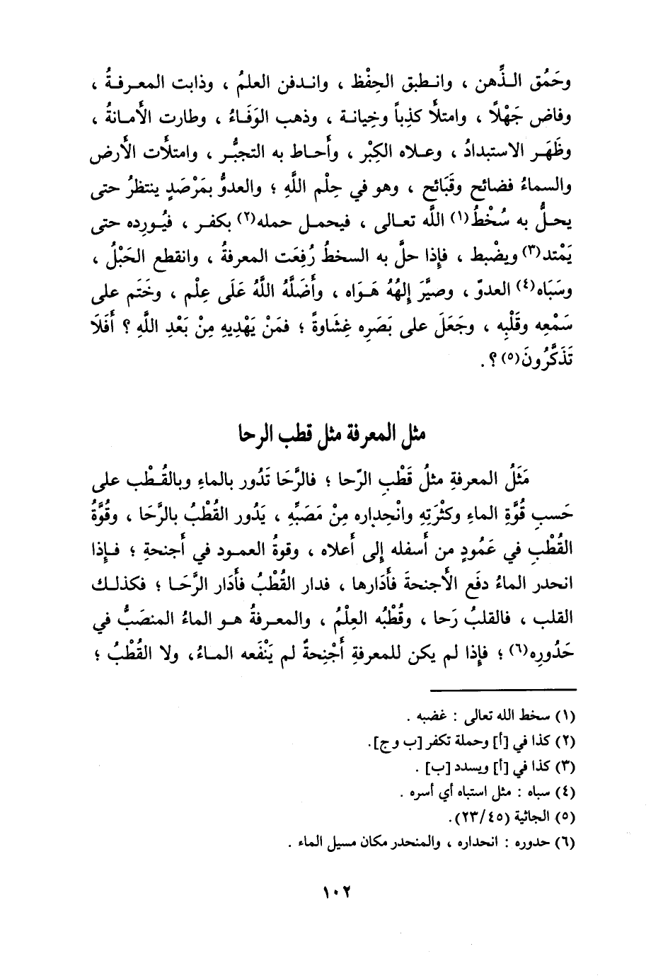 مثل الْمعرفَة مثل قطب الرحا فالرحا تَدور بِالْمَاءِ والقطب على حسب قُوَّة المَاء وكثرته وانحداره من مصبه يَدُور القطب بالرحا وَقُوَّة القطب فِي عَمُود من أَسْفَله إِلَى أَعْلَاهُ وَقُوَّة العمود فِي أَجْنِحَة فَإِذا انحدر المَاء دفع الأجنحة فأدارها فدار القطب فأدار الرحا فَكَذَلِك الْقلب فالقلب رَحا وقطبه الْعلم والمعرفة هُوَ المَاء المنصب فِي حدوره فَإِذا لم يكن للمعرفة أجنجة لم يَنْفَعهُ المَاء وَلَا القطب