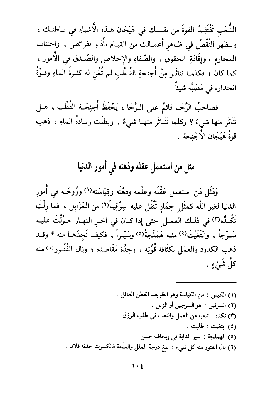 مثل من اسْتعْمل عقله وَعلمه وذهنه وكياسته وروحه فِي أُمُور الدُّنْيَا لغير الله كَمثل حمَار تنقل عَلَيْهِ سرقينا من الْمَزَابِل فَمَا زلت تكده فِي ذَلِك الْعَمَل حَتَّى إِذا كَانَ فِي آخر النَّهَار حولت عَلَيْهِ سرجا وابتغيت مِنْهُ هملجة وسيرا فَكيف تجدها مِنْهُ وَقد ذهب الكدود وَالْعَمَل بكثافة قوته وحدة مقاصده ونال الفتور مِنْهُ كل شَيْء