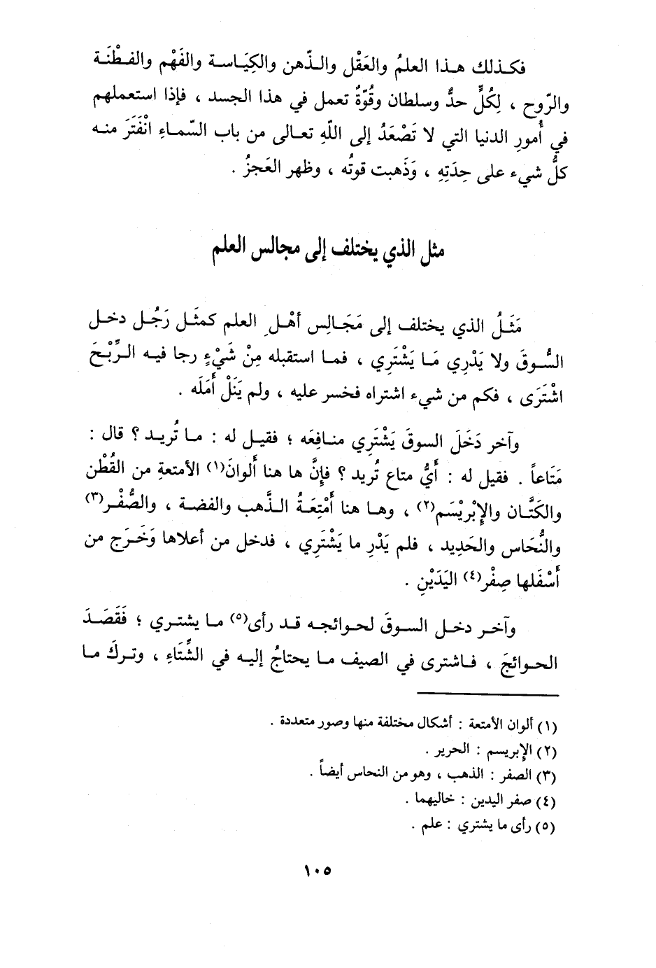 مثل الَّذِي يخْتَلف إِلَى مجَالِس أهل الْعلم كَمثل رجل دخل السُّوق وَلَا يدْرِي مَا يَشْتَرِي فَمَا استقبله من شَيْء رجا فِيهِ الرِّبْح اشْترى فكم من شَيْء اشْتَرَاهُ فخسر عَلَيْهِ وَلم ينل أمله