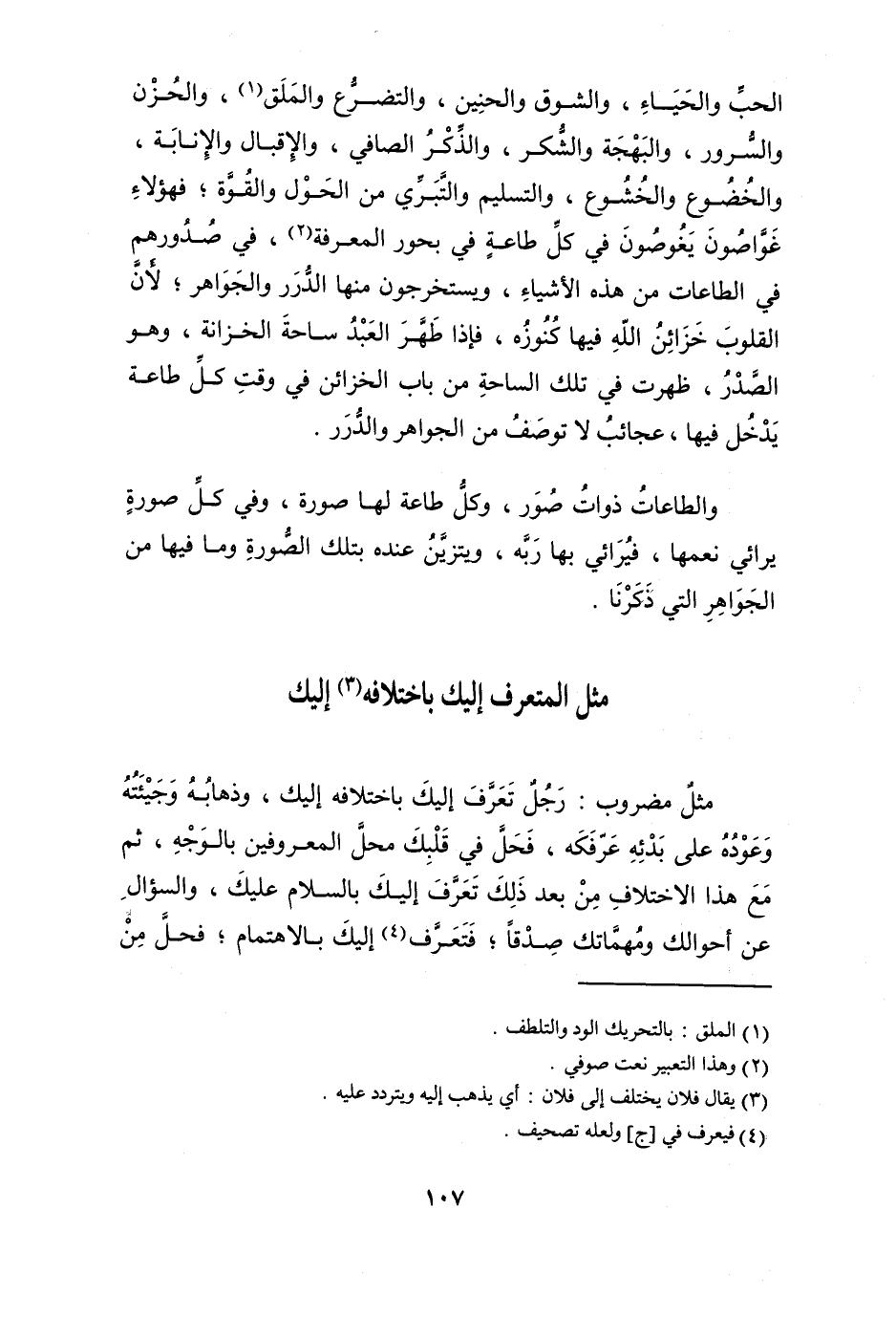 الْحبّ وَالْحيَاء والشوق والحنين والتضرع والملق والحزن وَالسُّرُور والبهجة وَالشُّكْر وَالذكر الصافي والإقبال والإنابة والخضوع والخشوع وَالتَّسْلِيم والتبري من الْحول وَالْقُوَّة هَؤُلَاءِ غواصون يغوصون فِي كل طَاعَة فِي بحور الْمعرفَة فِي صُدُورهمْ فِي الطَّاعَات من هَذِه الْأَشْيَاء ويستخرجون مِنْهَا الدُّرَر والجواهر لِأَن الْقُلُوب خَزَائِن الله فِيهَا كنوزه فَإِذا طهر العَبْد ساحة الخزانة وَهُوَ الصَّدْر ظَهرت فِي تِلْكَ الساحة من بَاب الخزائن فِي وَقت كل طَاعَة يدْخل فِيهَا لَا تُوصَف من الْجَوَاهِر والدرر