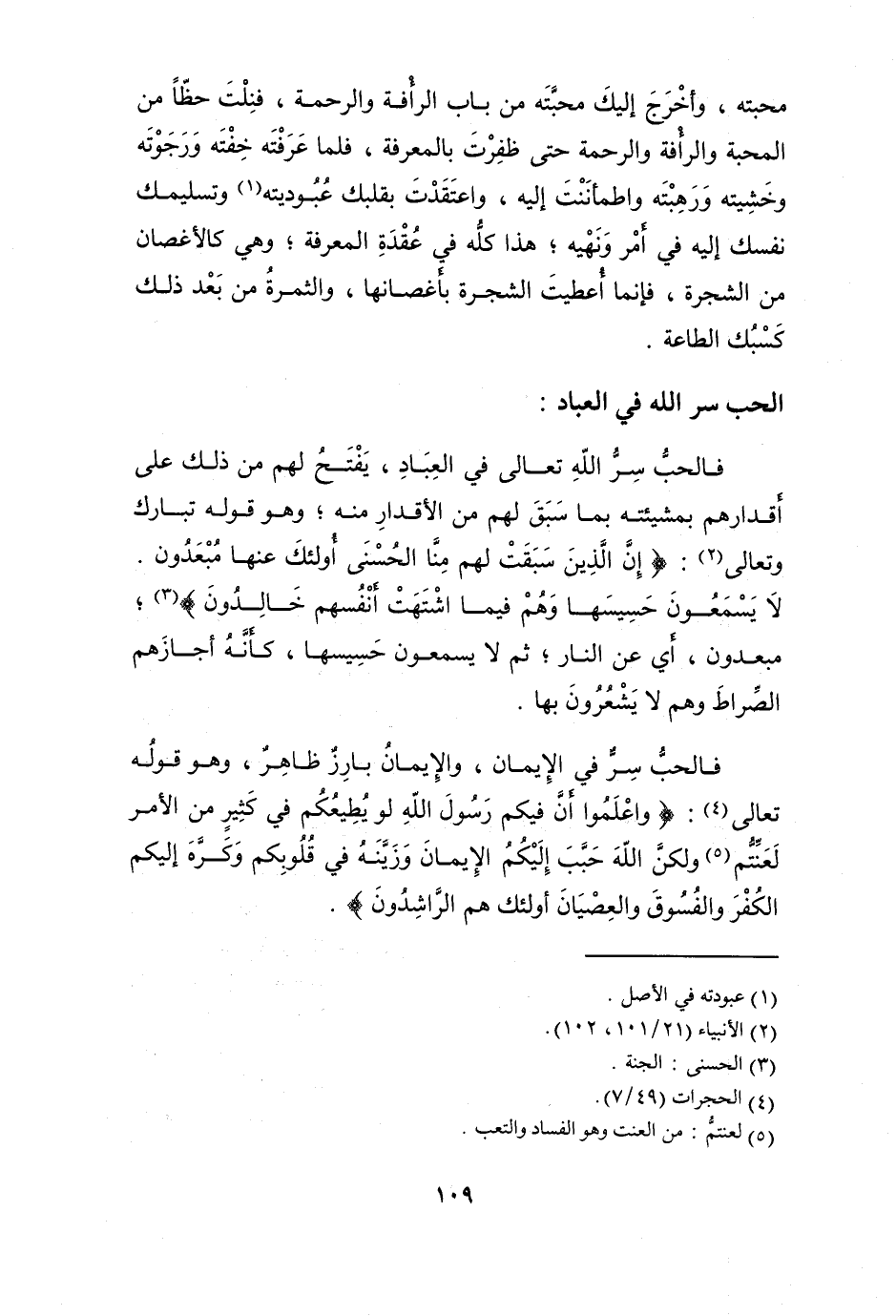 فالحب سر الله تَعَالَى فِي الْعباد يفتح لَهُم من ذَلِك على أقدارهم بمشيئته بِمَا سبق لَهُم من الأقدار مِنْهُ وَهُوَ قَوْله تبَارك وَتَعَالَى {إِن الَّذين سبقت لَهُم منا الْحسنى أُولَئِكَ عَنْهَا مبعدون لَا يسمعُونَ حَسِيسهَا وهم فِي مَا اشتهت أنفسهم خَالدُونَ} مبعدون أَي عَن النَّار ثمَّ لَا يسمعُونَ حَسِيسهَا كَأَنَّهُ أجازهم الصِّرَاط وهم لَا يَشْعُرُونَ بهَا