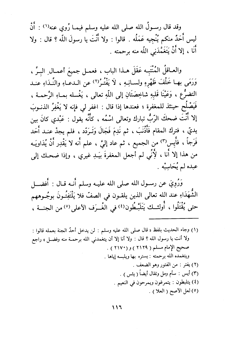 وَقد قَالَ رَسُول الله صلى الله عَلَيْهِ وَسلم فِيمَا رُوِيَ عَنهُ (أَن لَيْسَ أحد مِنْكُم ينجيه عمله) قَالُوا وَلَا أَنْت يَا رَسُول الله قَالَ (وَلَا أَنا إِلَّا أَن يتغمدني الله مِنْهُ برحمته)