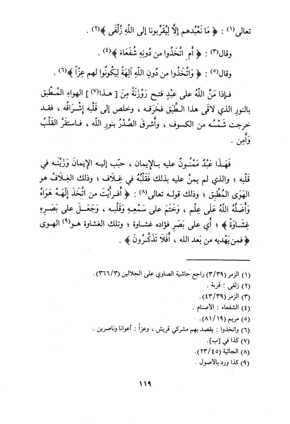 فَهَذَا عبد ممنون عَلَيْهِ بِالْإِيمَان حبب إِلَيْهِ الْإِيمَان وزينه فِي قلبه وَالَّذِي لم يمن عَلَيْهِ بذلك فقلبه فِي غلاف وَذَلِكَ الغلاف هُوَ الْهوى المطبق وَذَلِكَ قَوْله تَعَالَى {أَفَرَأَيْت من اتخذ إلهه هَوَاهُ وأضله الله على علم وَختم على سَمعه وَقَلبه وَجعل على بَصَره غشاوة} أَي على بصر فُؤَاده غشاوة وَتلك الغشاوة هُوَ الْهوى {فَمن يهديه من بعد الله أَفلا تذكرُونَ}