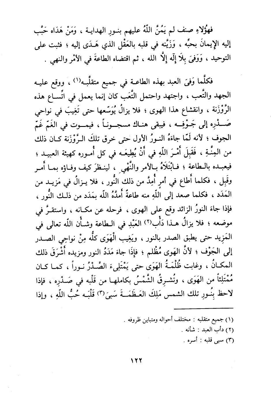 فَكلما وفى العَبْد بِهَذِهِ الطَّاعَة فِي جَمِيع متقلبه وَوَقع عَلَيْهِ الْجهد والتعب واجتهد وَاحْتمل التَّعَب كَانَ إِنَّمَا يعْمل فِي اتساع هَذِه الروزنة وانقشاع هَذَا الْهوى فَلَا يزَال يوسعها حَتَّى تغيب فِي نواحي صَدره إِلَى جَوْفه فَيبقى هُنَاكَ مسجونا فَيَمُوت فِي الْغم غم الْجوف لِأَنَّهُ لما جَاءَهُ النُّور الأول حَتَّى خرق تِلْكَ الروزنة كَانَ ذَلِك من الْمِنَّة فَقبل أَمر الله فِي أَن يطيعه فِي كل أُمُوره كَهَيئَةِ العبيد فيعبده بِالطَّاعَةِ فابتلاه بِالْأَمر وَالنَّهْي لينْظر كَيفَ وفاؤه بِمَا أَمر وَقبل فَكلما أطَاع فِي أَمر أمد من ذَلِك النُّور فَلَا يزَال فِي مزِيد من المدد فَكلما صعد إِلَى الله مِنْهُ طَاعَة أمده الله بمدد من ذَلِك النُّور فَإِذا جَاءَ النُّور الزَّائِد وَقع على الْهوى فرحله عَن مَكَانَهُ وَاسْتقر فِي مَوْضِعه فَلَا يزَال هَذَا دأب العَبْد فِي الطَّاعَة وشأن الله تَعَالَى فِي الْمَزِيد حَتَّى يطبق الصَّدْر بِالنورِ ويغيب الْهوى كُله من نواحي الصَّدْر إِلَى الْجوف لِأَن الْهوى مظلم فَإِذا جَاءَ مدد النُّور ومزيده أشرق ذَلِك الْمَكَان وَغَابَتْ ظلمَة الْهوى حَتَّى يمتلئ الصَّدْر نورا كَمَا كَانَ ممتلئا من الْهوى وتشرق الشَّمْس بكاملها من قلبه فِي صَدره فَإِذا لاحظ بِنور تِلْكَ الشَّمْس ملك العظمة سبى قلبه حب الله وَإِذا