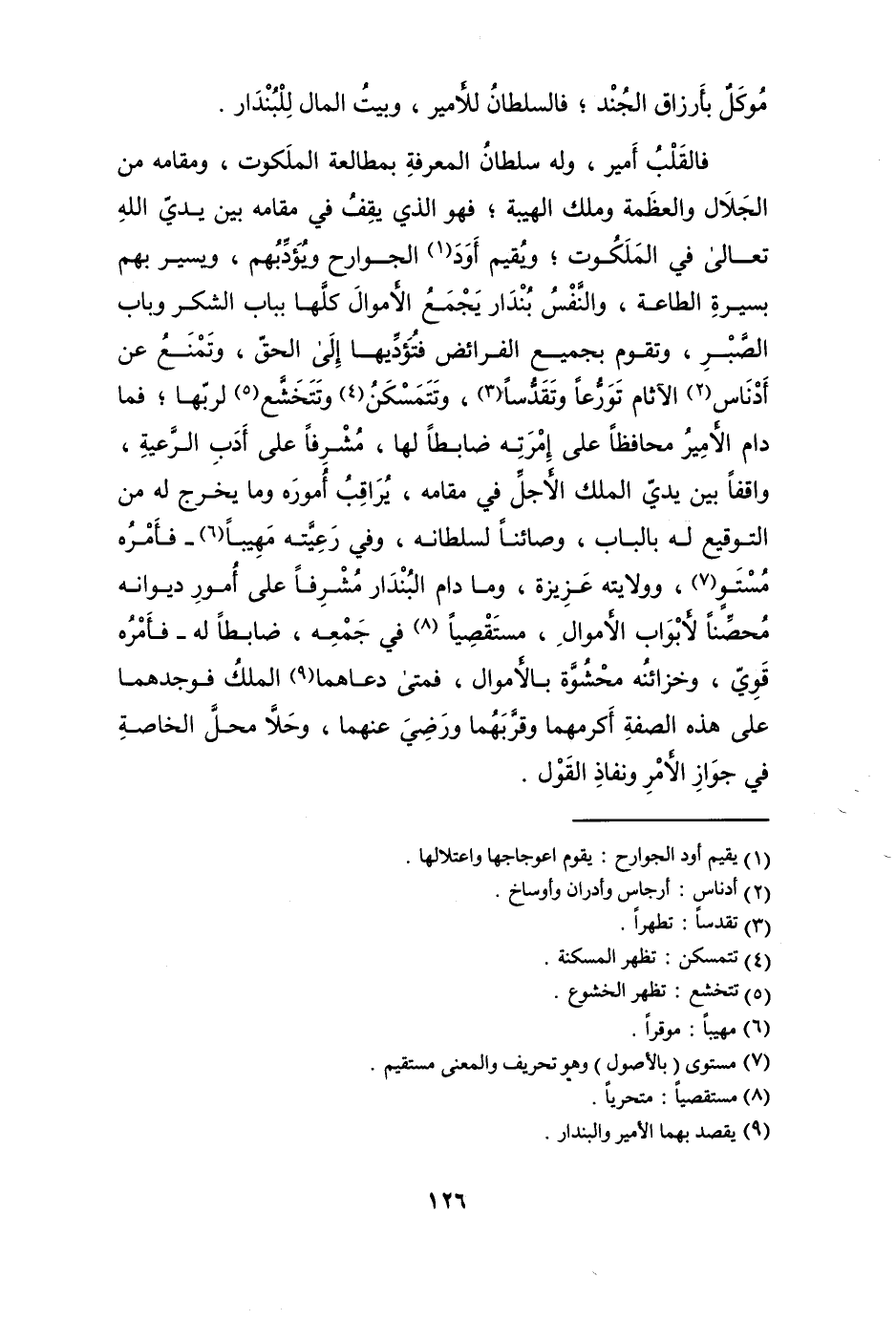 فالقلب أَمِير وَله سُلْطَان الْمعرفَة بمطالعة الملكوت ومقامه من الْجلَال وَالْعَظَمَة وَملك الهيبة فَهُوَ الَّذِي يقف فِي مقَامه بَين يَدي الله تَعَالَى فِي الملكوت وَيُقِيم أود الْجَوَارِح ويؤدبهم ويسير بهم بسيرة الطَّاعَة وَالنَّفس بنْدَار يجمع الْأَمْوَال كلهَا بِبَاب الشُّكْر وَبَاب الصَّبْر وَتقوم بِجَمِيعِ الْفَرَائِض فتؤديها إِلَى الْحق وتمنع عَن أدناس الآثام تورعا وتقدسا وتتمسكن وتتخشع لِرَبِّهَا فَمَا دَامَ الْأَمِير محافظا على إمرته ضابطا لَهَا مشرفا على أدب الرّعية وَاقِفًا بَين يَدي الْملك الْأَجَل فِي مقَامه يراقب أُمُوره وَمَا يخرج لَهُ من التوقيع لَهُ بِالْبَابِ وصائنا لسلطانه وَفِي رَعيته مهيبا فَأمره مستو وولايته عزيزة وَمَا دَامَ البندار مشرفا على أُمُور ديوانه مُحصنا لأبواب الْأَمْوَال مستقصيا فِي جمعه ضابطا لَهُ فَأمره قوي وخزائنه محشوة بالأموال فَمَتَى دعاهما الْملك فوجدهما على هَذِه الصّفة أكرمهما وقربهما وَرَضي عَنْهُمَا وحلا مَحل الْخَاصَّة فِي جَوَاز الْأَمر ونفاذ القَوْل