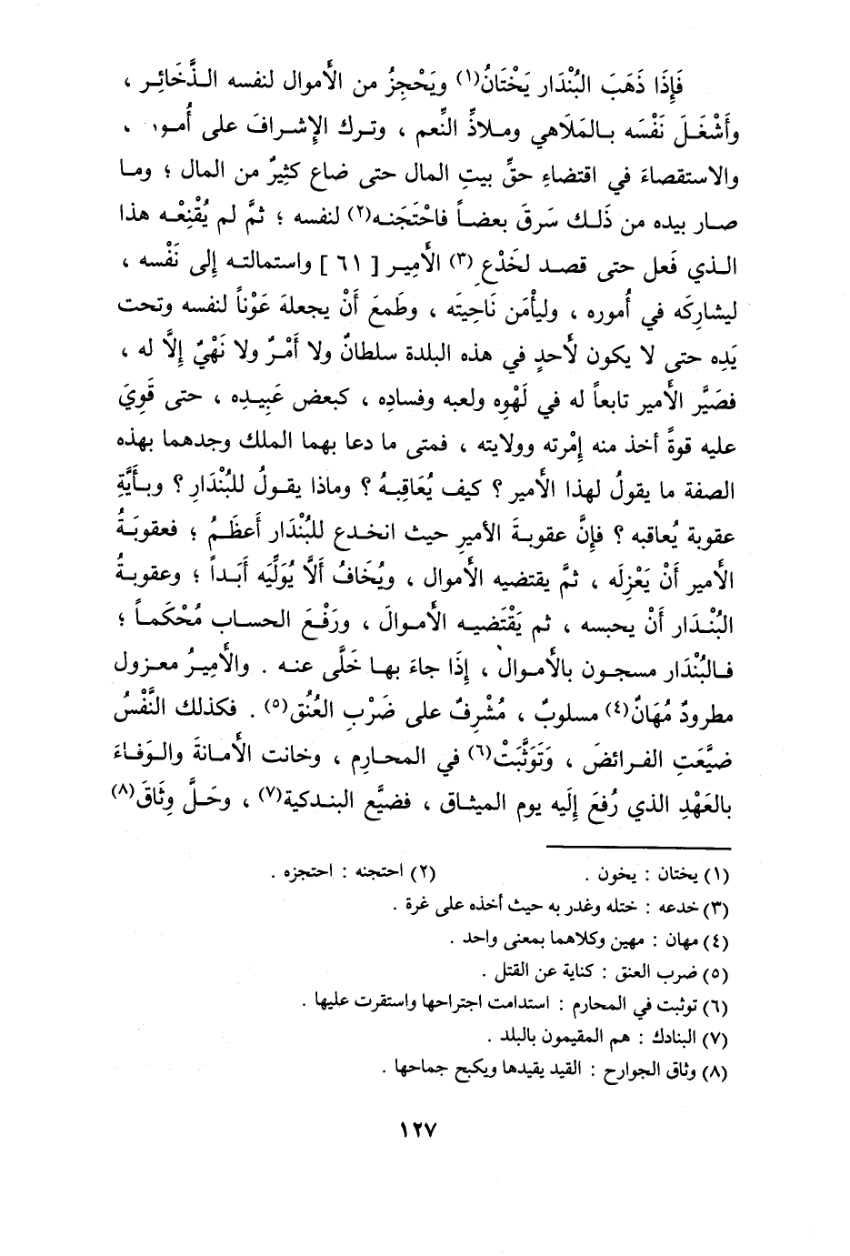 فَإِذا ذهب البندار يختان ويحجز من الْأَمْوَال لنَفسِهِ الذَّخَائِر وأشغل نَفسه بالملاهي وملاذ النعم وَترك الإشراف على أُمُوره وَالِاسْتِقْصَاء فِي اقْتِضَاء حق بَيت المَال حَتَّى ضَاعَ كثير من المَال وَمَا صَار بِيَدِهِ من ذَلِك سرق بَعْضًا فاحتجنه لنَفسِهِ ثمَّ لم يقنعه هَذَا الَّذِي فعل حَتَّى قصد لخدع الْأَمِير 61 واستمالته إِلَى نَفسه ليشاركه فِي أُمُوره وليأمن ناحيته وطمع أَن يَجعله عونا لنَفسِهِ وَتَحْت يَده حَتَّى لَا يكون لأحد فِي هَذِه الْبَلدة سُلْطَان وَلَا أَمر وَلَا نهي إِلَّا لَهُ فصير الْأَمِير تَابعا لَهُ فِي لهوه ولعبه وفساده كبعض عبيده حَتَّى قوي عَلَيْهِ قُوَّة أَخذ مِنْهُ إمرته وولايته فَمَتَى مَا دَعَا بهما الْملك وجدهما بِهَذِهِ الصّفة مَا يَقُول لهَذَا الْأَمِير كَيفَ يُعَاقِبهُ وماذا يَقُول للبندار وبأية عُقُوبَة يُعَاقِبهُ فَإِن عُقُوبَة الْأَمِير حَيْثُ انخدع للبندار أعظم فعقوبة الْأَمِير أَن يعزله ثمَّ يَقْتَضِيهِ الْأَمْوَال وَيخَاف أَلا يوليه أبدا وعقوبة البندار أَن يحْبسهُ ثمَّ يَقْتَضِيهِ الْأَمْوَال وَرفع الْحساب محكما فالبندار مسجون بالأموال إِذا جَاءَ بهَا خلى عَنهُ والأمير مَعْزُول مطرود مهان مسلوب مشرف على ضرب الْعُنُق فَكَذَلِك النَّفس ضيعت الْفَرَائِض وتوثبت فِي الْمَحَارِم وخانت الْأَمَانَة وَالْوَفَاء بالعهد الَّذِي رفع إِلَيْهِ يَوْم الْمِيثَاق فضيع البندكية وَحل وثاق