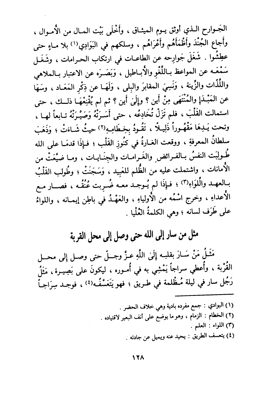 مثل من سَار بِقَلْبِه إِلَى الله عز وَجل حَتَّى وصل إِلَى مَحل الْقرْبَة وَأعْطِي سِرَاجًا يمشي بِهِ فِي أُمُوره ليَكُون على بَصِيرَة مثل رجل سَار فِي لَيْلَة مظْلمَة فِي طَرِيق فَهُوَ يتعسفه فَوجدَ سِرَاجًا