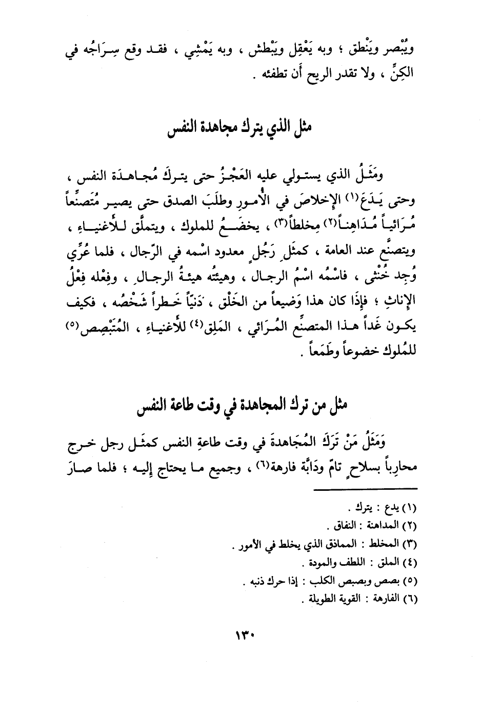 وَمثل من ترك المجاهدة فِي وَقت طَاعَة النَّفس كَمثل رجل خرج مُحَاربًا بسلاح تَامّ ودابة فارهة وَجَمِيع مَا يحْتَاج إِلَيْهِ فَلَمَّا صَار