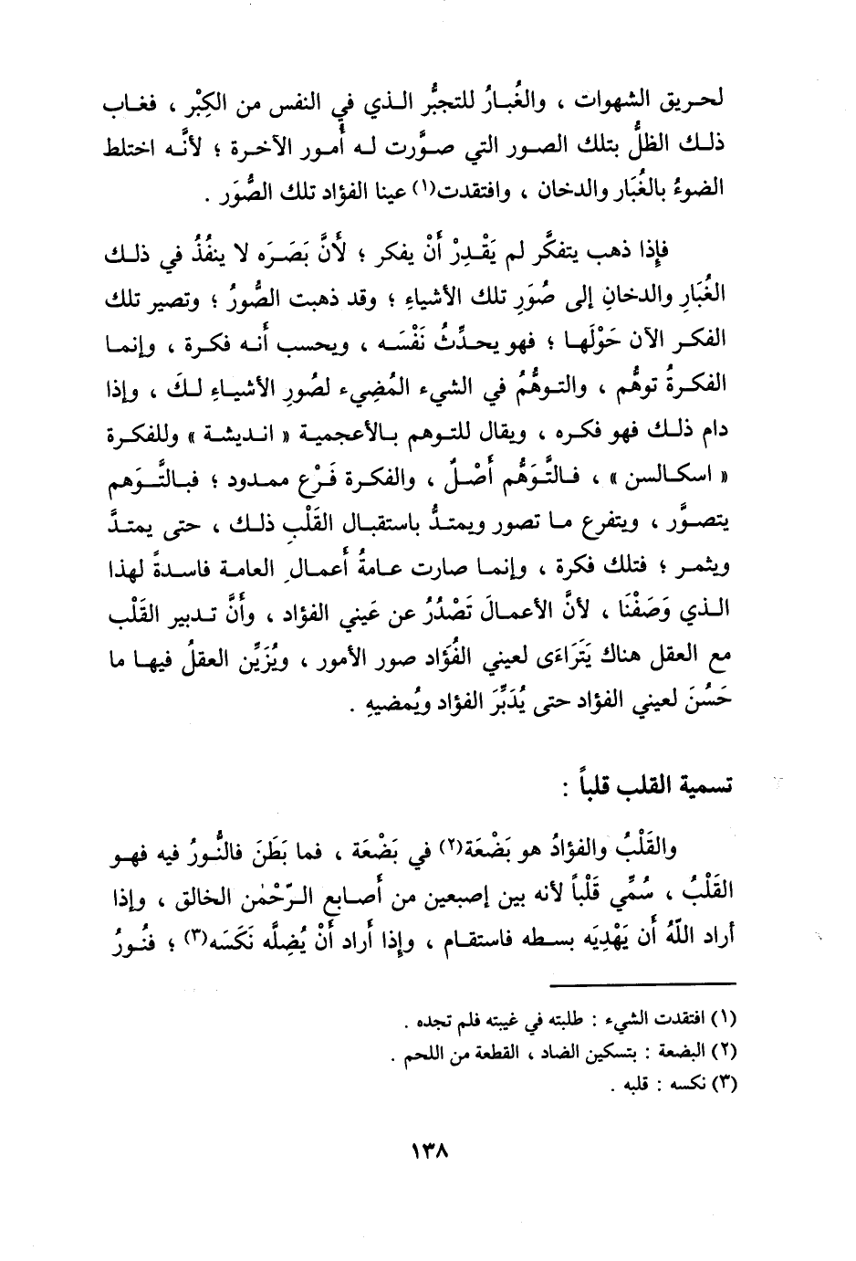 فَإِذا ذهب يتفكر لم يقدر أَن يفكر لِأَن بَصَره لَا ينفذ فِي ذَلِك الْغُبَار وَالدُّخَان إِلَى صور تِلْكَ الْأَشْيَاء وَقد ذهبت الصُّور وَتصير تِلْكَ الْفِكر الْآن حولهَا فَهُوَ يحدث نَفسه ويحسب أَنه فكر وَإِنَّمَا الفكرة توهم والتوهم فِي الشَّيْء المضيء لصور الْأَشْيَاء لَك وَإِذا دَامَ ذَلِك فَهُوَ فكرة وَيُقَال للتوهم بالأعجمية انديشة وللفكرة اسكالسن فالتوهم أصل والفكرة فرع مَمْدُود فبالتوهم يتَصَوَّر وَيتَفَرَّع مَا تصور ويمتد باستقبال الْقلب ذَلِك حَتَّى يَمْتَد ويثمر فَتلك فكرة وَإِنَّمَا صَارَت عَامَّة أَعمال الْعَامَّة فَاسِدَة لهَذَا الَّذِي وَصفنَا لِأَن الْأَعْمَال تصدر عَن عَيْني الْفُؤَاد وَأَن تَدْبِير الْقلب مَعَ الْعقل هُنَاكَ يتَرَاءَى لعَيْنِي الْفُؤَاد صور الْأُمُور ويزين الْعقل فِيهَا مَا حسن لعَيْنِي الْفُؤَاد حَتَّى يدبر الْفُؤَاد ويمضيه