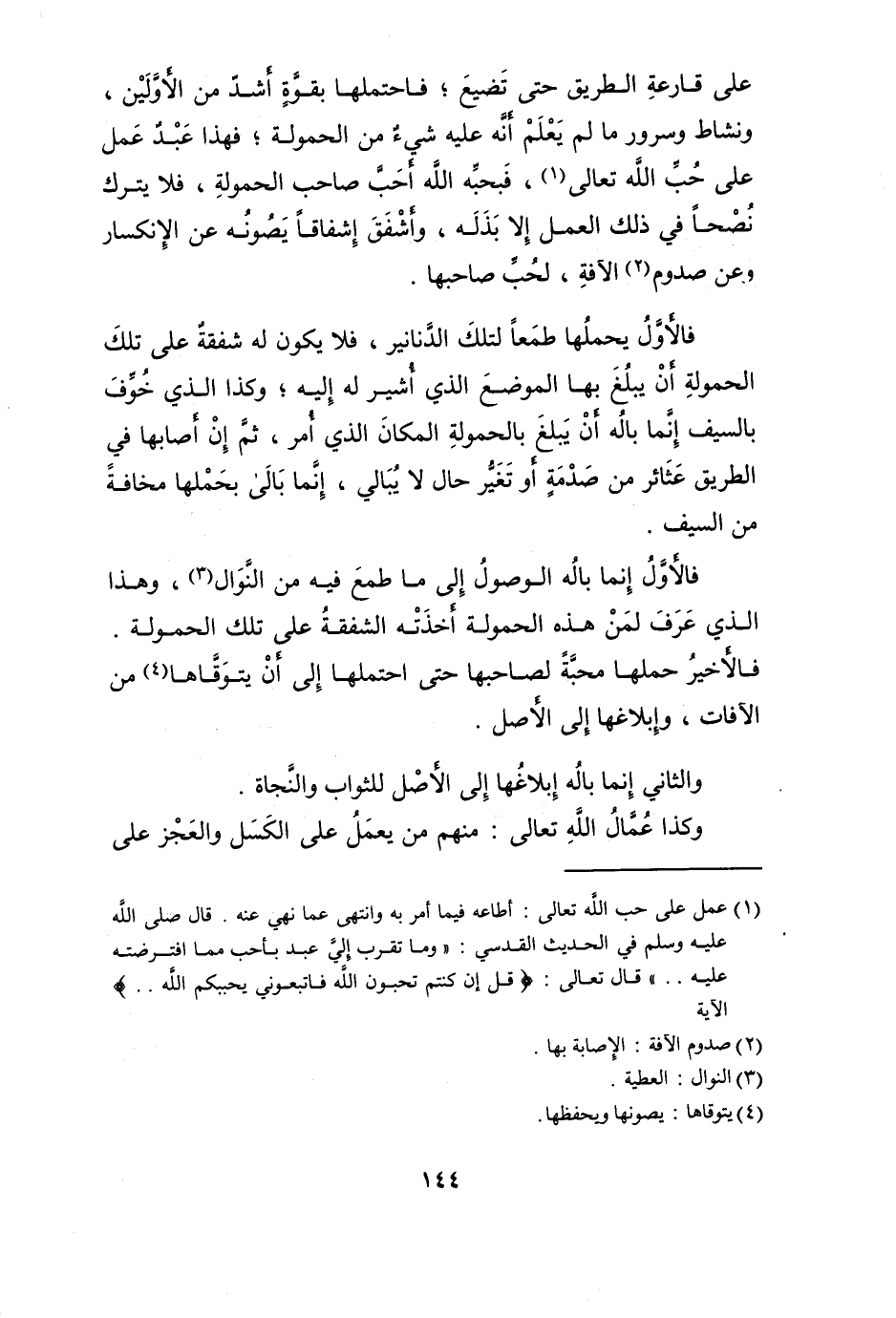 على قَارِعَة الطَّرِيق حَتَّى تضيع فاحتملها بِقُوَّة أَشد من الْأَوَّلين ونشاط وسرور مَا لم يعلم أَنه عَلَيْهِ شَيْء من الحمولة فَهَذَا عبد عمل على حب الله تَعَالَى فبحبه الله أحب صَاحب الحمولة فَلَا يتْرك نصحا فِي ذَلِك الْعَمَل إِلَّا بذله وأشفق إشفاقا يصونه عَن الإنكسار وَعَن صدوم الآفة لحب صَاحبهَا