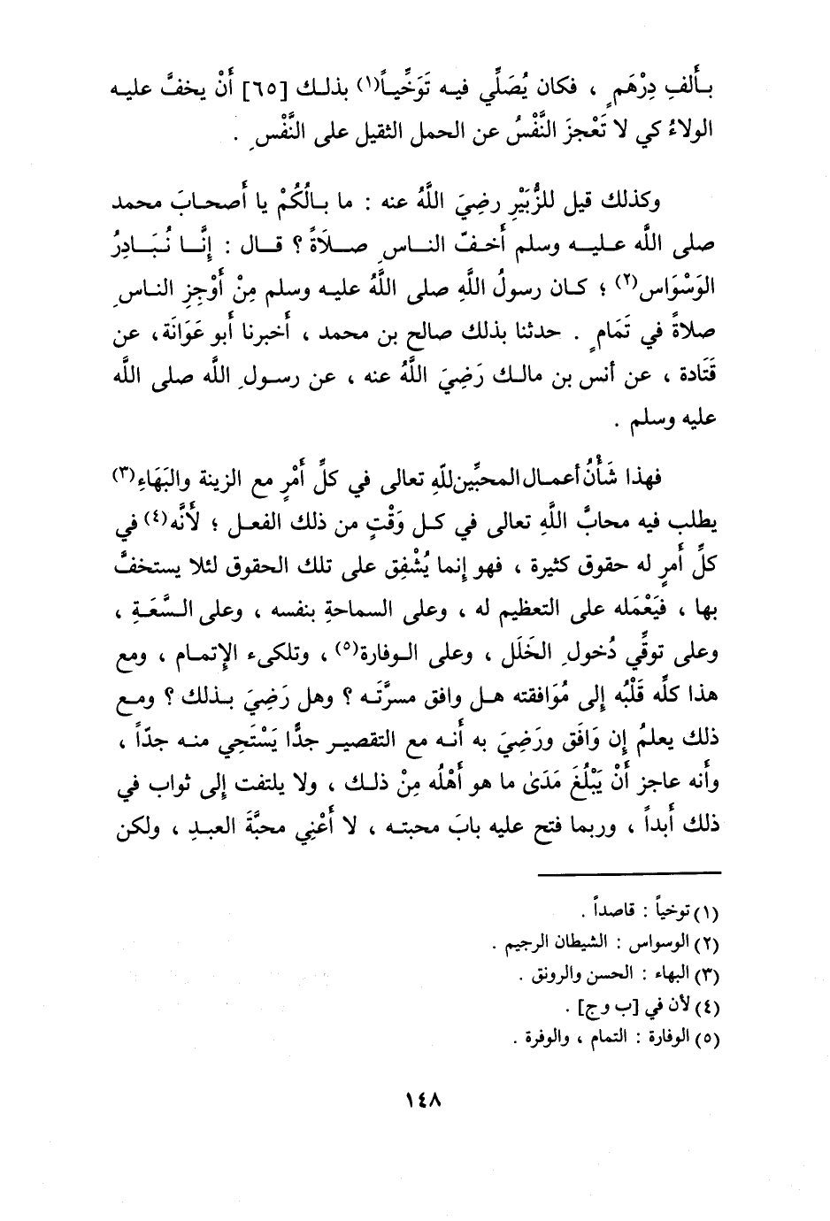 وَكَذَلِكَ قيل للزبير رَضِي الله عَنهُ مَا بالكم يَا أَصْحَاب مُحَمَّد صلى الله عَلَيْهِ وَسلم أخف النَّاس صَلَاة قَالَ إِنَّا نبادر الوسواس كَانَ رَسُول الله صلى الله عَلَيْهِ وَسلم من أوجز النَّاس صَلَاة فِي تَمام حَدثنَا بذلك صَالح بن مُحَمَّد أخبرنَا أَبُو عوَانَة عَن قَتَادَة عَن أنس بن مَالك رَضِي الله عَنهُ عَن رَسُول الله صلى الله عَلَيْهِ وَسلم