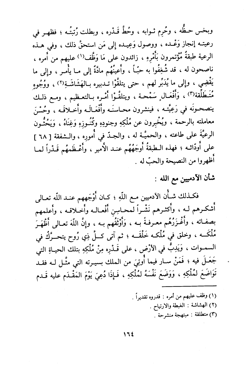 فَكَذَلِك شَأْن الْآدَمِيّين مَعَ الله كَانَ أوجههم عِنْد الله تَعَالَى أشكرهم لَهُ وَأَكْثَرهم نشرا لمحاسن أَفعاله وأخلاقه وأعلمهم بصفاته وأغزرهم معرفَة بِهِ وأوثقهم بِهِ وَإِن الله تَعَالَى أظهر ملكه وَخلق فِي ملكه خلقه ثمَّ آتى كل ذِي روح يَتَحَرَّك فِي السَّمَوَات ويدب فِي الأَرْض على قدره من ملكه بِتِلْكَ الْحَيَاة الَّتِي جعل فِيهِ فَمن سَار فِيمَا أُوتِيَ من الْملك بسيرته الَّتِي مثل لَهُ فقد تواضع لملكه وَوضع نَفسه لملكه فَإِذا دعِي يَوْم الْمُقدم عَلَيْهِ قدم