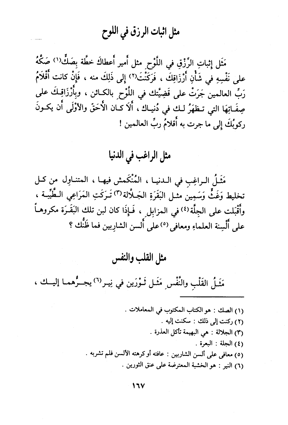 مثل إِثْبَات الرزق فِي اللَّوْح مثل أَمِير أَعْطَاك خطة بصك صَكه على نَفسه فِي شَأْن أرزاقك فركنت إِلَى ذَلِك مِنْهُ فَإِن كَانَت أَقْلَام رب الْعَالمين جرت على قضيتك فِي اللَّوْح بالكائن وبأرزاقك على صفاتها الَّتِي تظهر لَك فِي دنياك أَلا كَانَ الأحق وَالْأولَى أَن يكون ركوبك إِلَى مَا جرت بِهِ أَقْلَام رب الْعَالمين