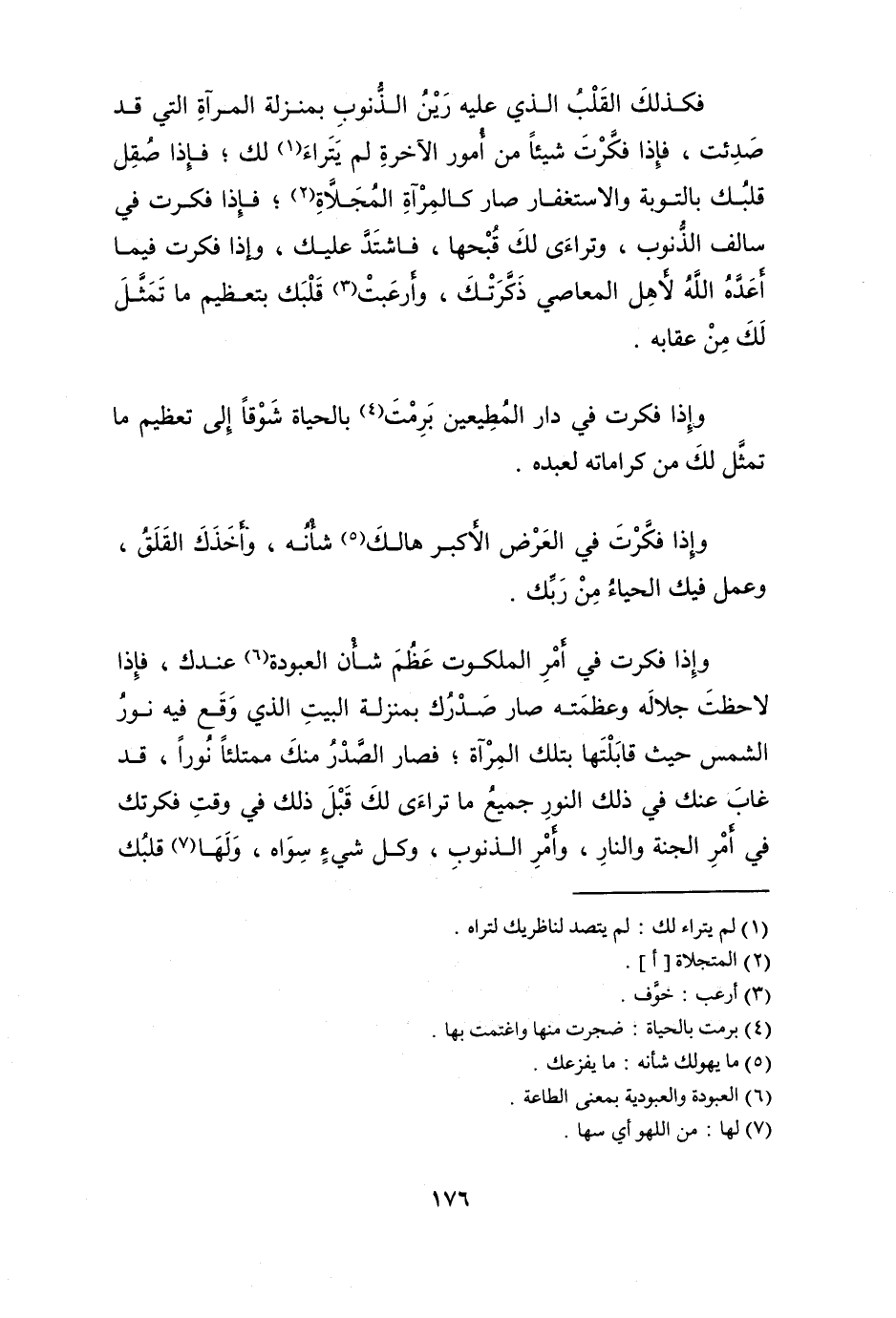 وَإِذا فَكرت فِي أَمر الملكوت عظم شَأْن العبودة عنْدك فَإِذا لاحظت جَلَاله وعظمته صَار صدرك بِمَنْزِلَة الْبَيْت الَّذِي وَقع فِيهِ نور الشَّمْس حَيْثُ قابلتها بِتِلْكَ الْمرْآة فَصَارَ الصَّدْر مِنْك ممتلئا نورا قد غَابَ عَنْك فِي ذَلِك النُّور جَمِيع مَا ترَاءى لَك قبل ذَلِك فِي وَقت فكرتك فِي أَمر الْجنَّة وَالنَّار وَأمر الذُّنُوب وكل شَيْء سواهُ وَلها قَلْبك