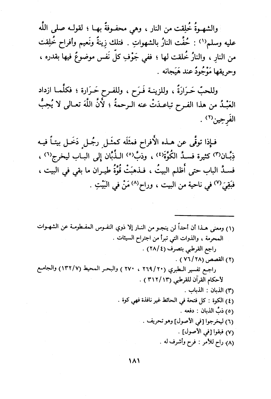 والشهوة خلقت من النَّار وَهِي محفوفة بهَا لقَوْله صلى الله عَلَيْهِ وَسلم (حفت النَّار بالشهوات) فَتلك زِينَة ونعيم وأفراح خلقت من النَّار وَالنَّار خلقت لَهَا فَفِي جَوف كل نفس مَوْضُوع فِيهَا بِقَدرِهِ وحريقها مَوْجُود عِنْد هيجانه