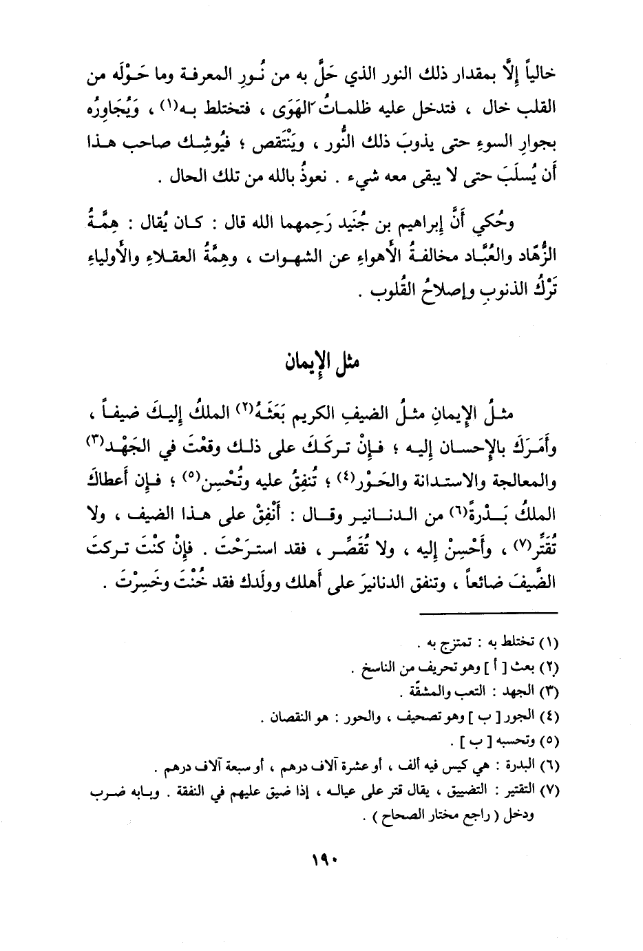 مثل الْإِيمَان مثل الضَّيْف الْكَرِيم بَعثه الْملك إِلَيْك ضيفا وأمرك بِالْإِحْسَانِ إِلَيْهِ فَإِن تَركك على ذَلِك وَقعت فِي الْجهد والمعالجة والاستدانة والحور تنْفق عَلَيْهِ وتحسن فَإِن أَعْطَاك الْملك بدرة من الدَّنَانِير وَقَالَ أنْفق على هَذَا الضَّيْف وَلَا تقتر وَأحسن إِلَيْهِ وَلَا تقصر فقد استرحت فَإِن كنت تركت الضَّيْف ضائعا وتنفق الدَّنَانِير على أهلك وولدك فقد خُنْت وخسرت