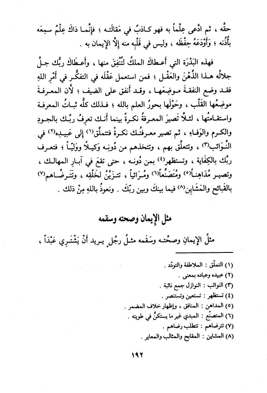 فَهَذِهِ البدرة الَّتِي أَعْطَاك الْملك لتنفق مِنْهَا وأعطاك رَبك جلّ جَلَاله هَذَا الذِّهْن وَالْعقل فَمن اسْتعْمل عقله فِي التفكر فِي أَمر الله فقد وضع النَّفَقَة موضعهَا وَقد أنْفق على الضَّيْف لِأَن الْمعرفَة موضعهَا الْقلب وحولها بحور الْعلم بِاللَّه فَذَلِك كُله ثبات الْمعرفَة واستقامتها لِئَلَّا تصير الْمعرفَة نكرَة بَيْنَمَا أَنَّك تعرف رَبك بالجود وَالْكَرم وَالْوَفَاء ثمَّ تصير معرفتك نكرَة فتتملق إِلَى عبيده فِي النوائب وتتعلق بهم وتتخذهم من دونه وَكيلا ووليا فتعرف رَبك بالكفاية وتستظهر بِمن دونه حَتَّى تقع فِي آبار المهالك وَتصير مداهنا ومتصنعا ومرائيا تتزين لخلقه وتترضاهم بالقبائح والمشاين فِيمَا بَيْنك وَبَين رَبك ونعوذ بِاللَّه من ذَلِك