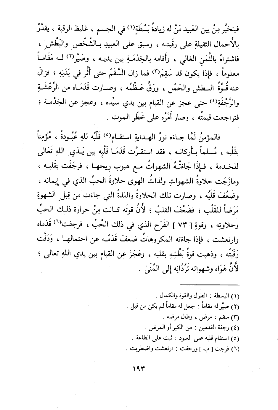فالمؤمن لما جَاءَهُ نور الْهِدَايَة استقام قلبه لله عبودة مُؤمنا بِقَلْبِه مُسلما بأركانه فقد اسْتَقَرَّتْ قدما قلبه بَين يَدي الله تَعَالَى للْخدمَة فاذا جَاءَتْهُ الشَّهَوَات مَعَ هبوب رِيحهَا فرجفت بِقَلْبِه ومازجت حلاوة الشَّهَوَات ولذات الْهوى حلاوة الْحبّ الَّذِي فِي إيمَانه وَضعف قلبه وَصَارَت تِلْكَ الْحَلَاوَة واللذة الَّتِي جَاءَت من قبل الشَّهْوَة مَرضا للقلب فضعف الْقلب لِأَن قوته كَانَت من حرارة ذَلِك الْحبّ وحلاوته وَقُوَّة 73 الْفَرح الَّذِي فِي ذَلِك الْحبّ فرجفت قدماه وارتعشت فَإِذا جَاءَتْهُ المكروهات ضعف قدمه عَن احتمالها ودقت رقبته وَذَهَبت قُوَّة بطشه بِقَلْبِه وَعجز عَن الْقيام بَين يَدي الله تَعَالَى لِأَن هَوَاهُ وشهواته تردانه إِلَى المنى