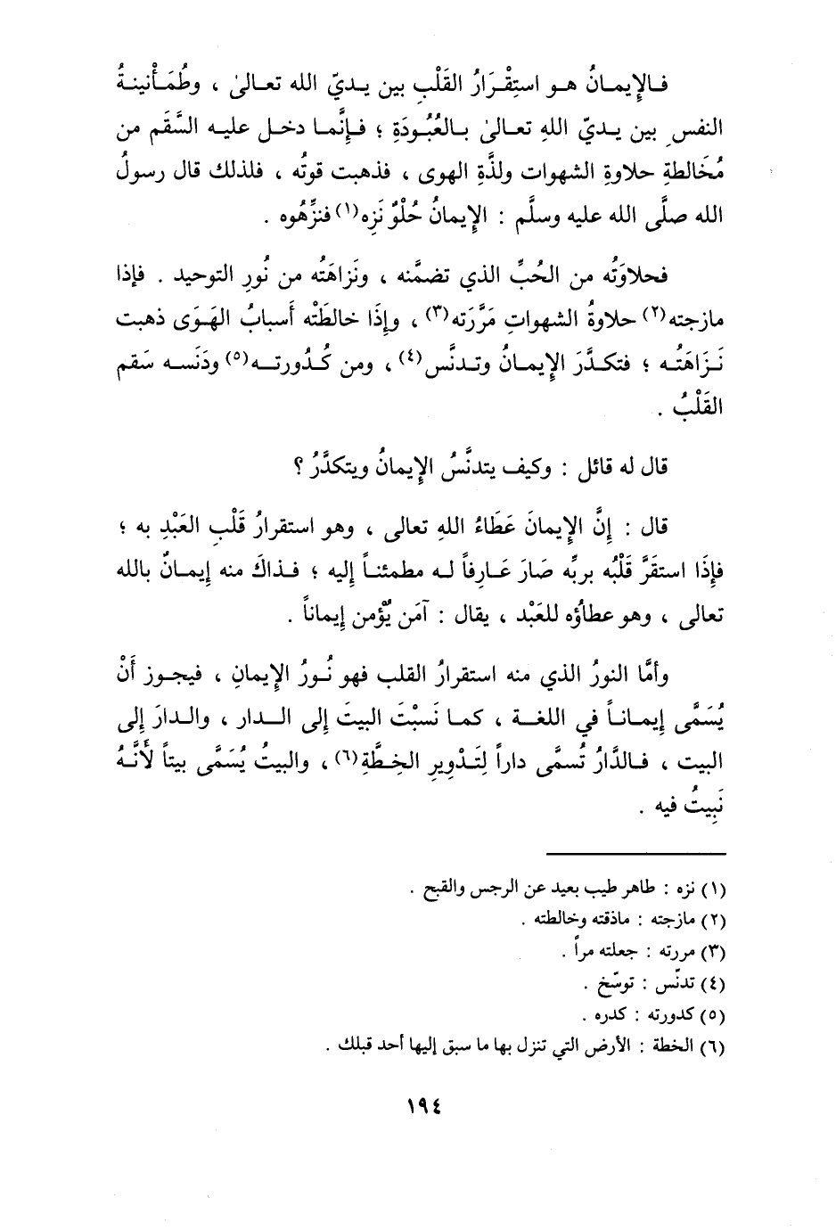 وَأما النُّور الَّذِي مِنْهُ اسْتِقْرَار الْقلب فَهُوَ نور الْإِيمَان فَيجوز أَن يُسمى إِيمَانًا فِي اللُّغَة كَمَا نسبت الْبَيْت إِلَى الدَّار وَالدَّار إِلَى الْبَيْت فالدار تسمى دَارا لتدوير الخطة وَالْبَيْت يُسمى بَيْتا لِأَنَّهُ نبيت فِيهِ