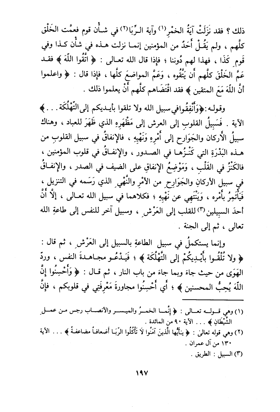 وَإِنَّمَا يستكمل فِي سَبِيل الطَّاعَة بالسبيل إِلَى الْعَرْش ثمَّ قَالَ {وَلَا تلقوا بِأَيْدِيكُمْ إِلَى التَّهْلُكَة} فيدعو مجاهدة النَّفس ورد الْهوى من حَيْثُ جَاءَ وَبِمَا جَاءَ من بَاب النَّار ثمَّ قَالَ {وأحسنوا إِن الله يحب الْمُحْسِنِينَ} أَي أَحْسنُوا مجاورة معرفتي فِي قُلُوبكُمْ فَإِن