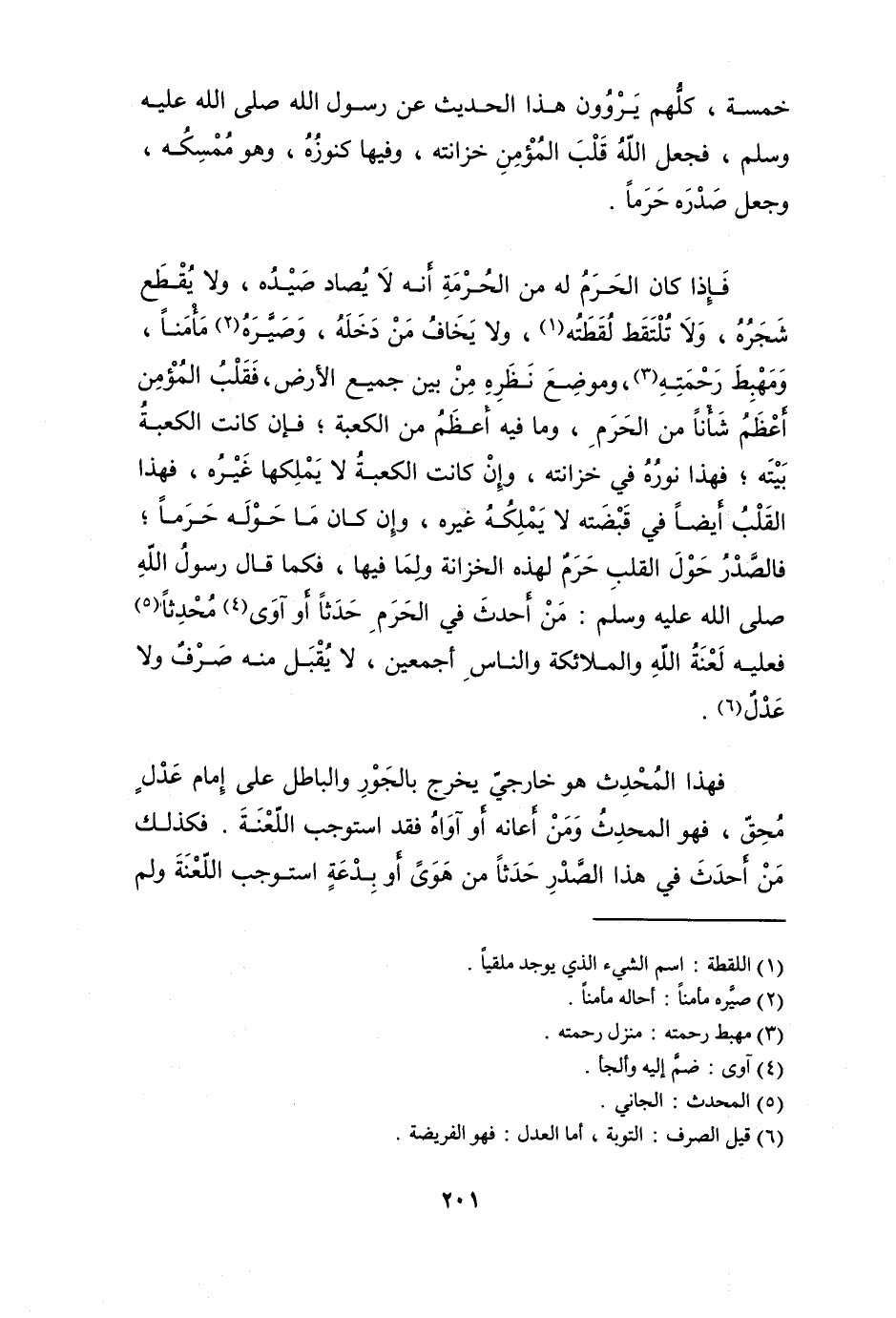 فَإِذا كَانَ الْحرم لَهُ من الْحُرْمَة أَنه لَا يصاد صَيْده وَلَا يقطع شَجَره وَلَا تلْتَقط لقطته وَلَا يخَاف من دخله وصيره مأمنا ومهبط رَحمته وَمَوْضِع نظره من بَين جَمِيع الأَرْض فَقلب الْمُؤمن أعظم شَأْنًا من الْحرم وَمَا فِيهِ أعظم من الْكَعْبَة فَإِن كَانَت الْكَعْبَة بَيته فَهَذَا نوره فِي خزانته وَإِن كَانَت الْكَعْبَة لَا يملكهَا غَيره فَهَذَا الْقلب أَيْضا فِي قَبضته لَا يملكهُ غَيره وَإِن كَانَ مَا حوله حرما فالصدر حول الْقلب حرم لهَذِهِ الخزانة وَلما فِيهَا فَكَمَا قَالَ رَسُول الله صلى الله عَلَيْهِ وَسلم (من أحدث فِي الْحرم حَدثا أَو آوى مُحدثا فَعَلَيهِ لعنة الله وَالْمَلَائِكَة وَالنَّاس أَجْمَعِينَ لَا يقبل مِنْهُ صرف وَلَا عدل)