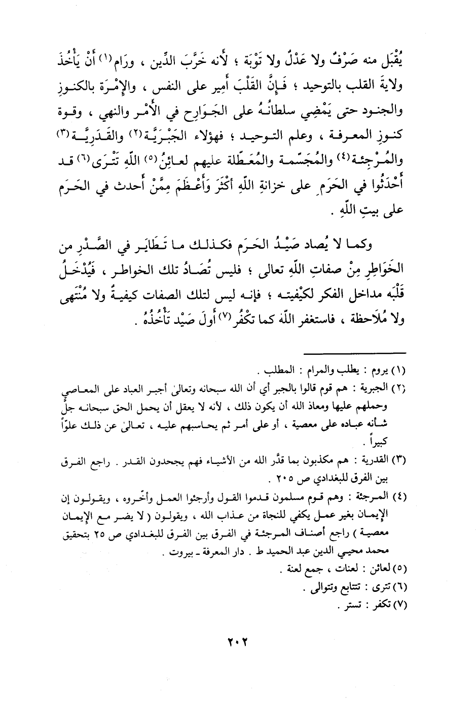 يقبل مِنْهُ صرف وَلَا عدل وَلَا تَوْبَة لِأَنَّهُ خرب الدّين ورام أَن يَأْخُذ ولَايَة الْقلب بِالتَّوْحِيدِ فَإِن الْقلب أَمِير على النَّفس والإمرة بالكنوز والجنود حَتَّى يمْضِي سُلْطَانه على الْجَوَارِح فِي الْأَمر وَالنَّهْي وَقُوَّة كنوز الْمعرفَة وَعلم التَّوْحِيد فَهَؤُلَاءِ الجبرية والقدرية والمرجئة والمجسمة والمعطلة عَلَيْهِم لعائن الله تترى قد أَحْدَثُوا فِي الْحرم على خزانَة الله أَكثر وَأعظم مِمَّن أحدث فِي الْحرم على بَيت المَال