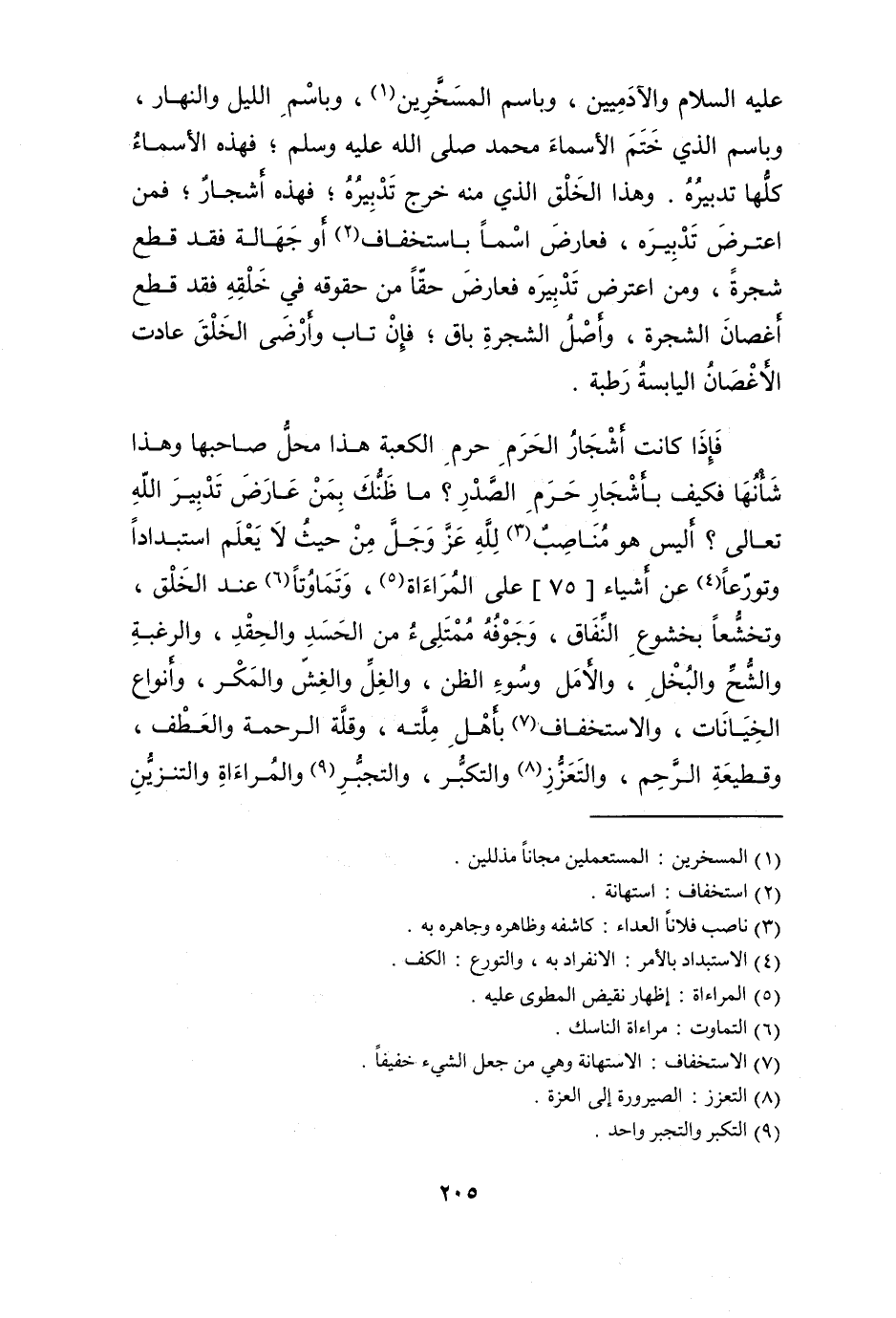 عَلَيْهِ السَّلَام والآدميين وباسم المسخرين وباسم اللَّيْل وَالنَّهَار وباسم الَّذِي ختم الْأَسْمَاء مُحَمَّد صلى الله عَلَيْهِ وَسلم فَهَذِهِ الْأَسْمَاء كلهَا تَدْبيره وَهَذَا الْخلق الَّذِي مِنْهُ خرج تَدْبيره فَهَذِهِ أَشجَار فَمن اعْترض تَدْبيره فعارض اسْما باستخفاف أَو جَهَالَة فقد قطع شَجَرَة وَمن اعْترض تَدْبيره فعارض حَقًا من حُقُوقه فِي خلقه فقد قطع أَغْصَان الشَّجَرَة وأصل الشَّجَرَة بَاقٍ فَإِن تَابَ وأرضى الْخلق عَادَتْ الأغصان الْيَابِسَة رطبَة