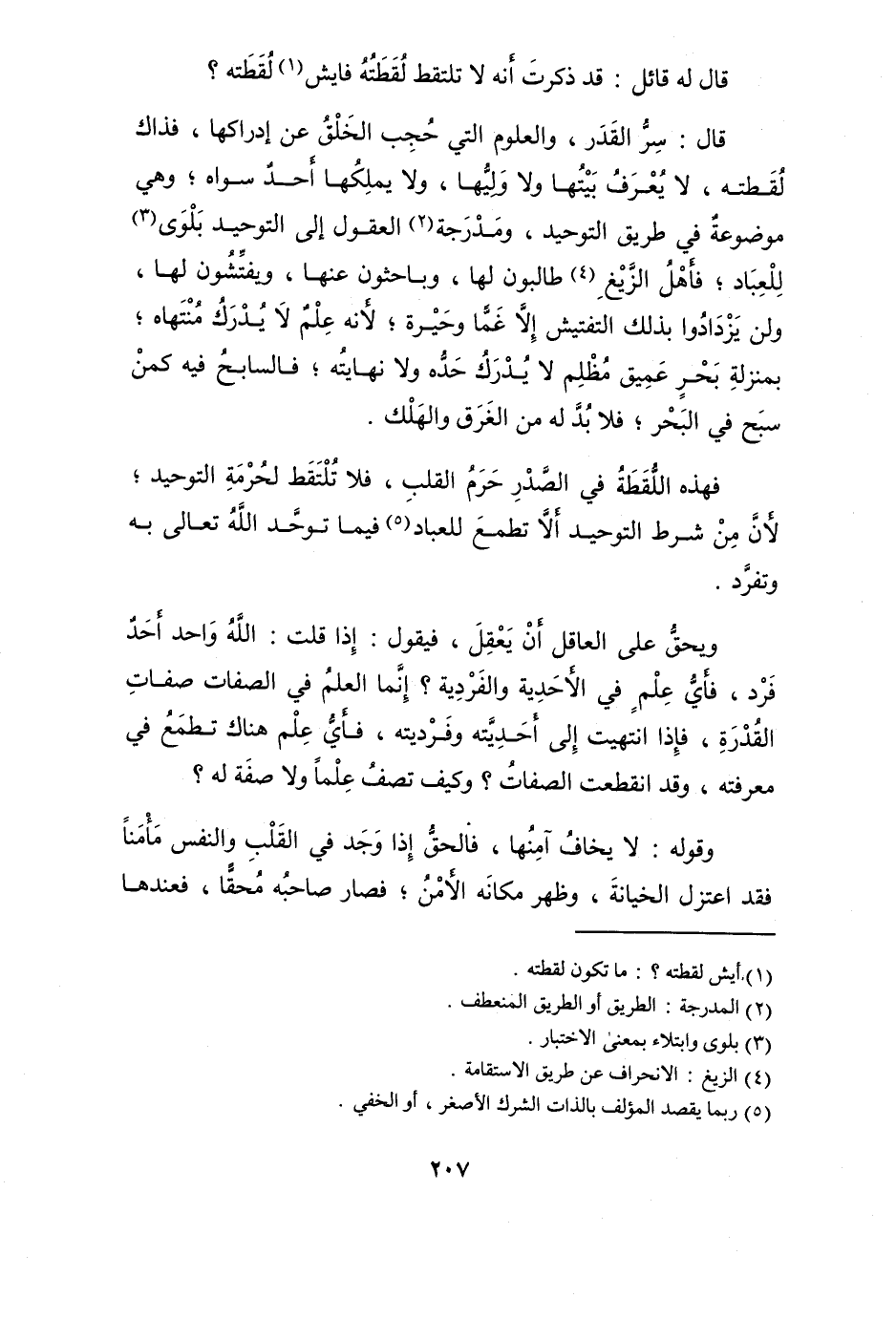 قَالَ سر الْقدر والعلوم الَّتِي حجب الْخلق عَن إِدْرَاكهَا فَذَاك لقطته لَا يعرف بَيتهَا وَلَا وَليهَا وَلَا يملكهَا أحد سواهُ وَهِي مَوْضُوعَة فِي طَرِيق التَّوْحِيد ومدرجة الْعُقُول إِلَى التَّوْحِيد بلوى للعباد فَأهل الزيغ طالبوت لَهَا وباحثون عَنْهَا ويفتشون لَهَا وَلنْ يزدادوا بذلك التفتيش إِلَّا غما وحيرة لِأَنَّهُ علم لَا يدْرك منتهاه بِمَنْزِلَة بَحر عميق مظلم لَا يدْرك حَده وَلَا نهايته فالسابح فِيهِ كمن سبح فِي الْبَحْر فَلَا بُد لَهُ من الْغَرق والهلك