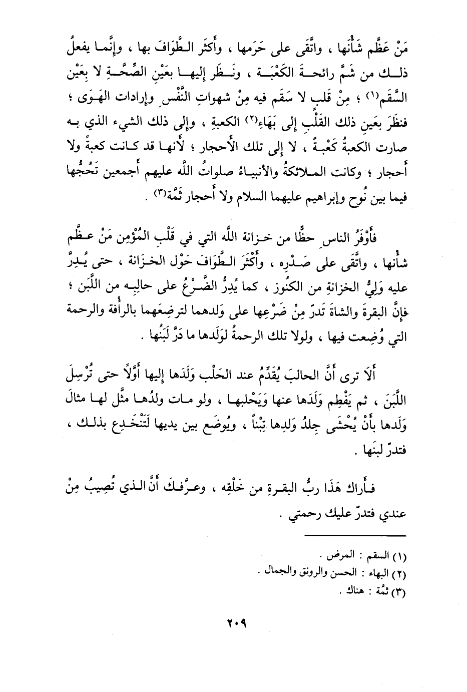 من عظم شَأْنهَا وَاتَّقَى على حرمهَا وَأكْثر الطّواف بهَا وَإِنَّمَا يفعل ذَلِك من شم رَائِحَة الْكَعْبَة وَنظر إِلَيْهَا بِعَين الصِّحَّة لَا بِعَين السقم من قلب لَا سقم فِيهِ من شهوات النَّفس وإرادات الْهوى فَنظر بِعَين ذَلِك الْقلب إِلَى بهاء الْكَعْبَة وَإِلَى ذَلِك الشَّيْء الَّذِي بِهِ صَارَت الْكَعْبَة كعبة لَا إِلَى تِلْكَ الْأَحْجَار لِأَنَّهَا قد كَانَت كعبة وَلَا أَحْجَار وَكَانَت الْمَلَائِكَة والأنبياء صلوَات الله عَلَيْهِم أَجْمَعِينَ تحجها فِيمَا بَين نوح وَإِبْرَاهِيم عَلَيْهِمَا السَّلَام وَلَا أَحْجَار ثمَّة