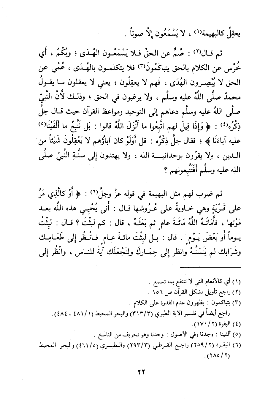 ثمَّ ضرب لَهُم مثل الْبَهِيمَة فِي قَوْله عز وَجل {أَو كَالَّذي مر على قَرْيَة وَهِي خاوية على عروشها قَالَ أَنى يحيي هَذِه الله بعد مَوتهَا فأماته الله مائَة عَام ثمَّ بَعثه قَالَ كم لَبِثت قَالَ لَبِثت يَوْمًا أَو بعض يَوْم قَالَ بل لَبِثت مائَة عَام فَانْظُر إِلَى طَعَامك وشرابك لم يتسنه وَانْظُر إِلَى حِمَارك ولنجعلك آيَة للنَّاس وَانْظُر إِلَى الْعِظَام كَيفَ ننشزها ثمَّ نكسوها لَحْمًا فَلَمَّا تبين لَهُ قَالَ أعلم أَن الله على كل شَيْء قدير}