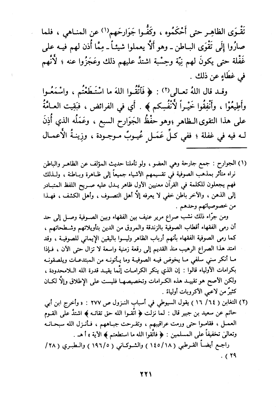 وَقد قَالَ الله تَعَالَى {فَاتَّقُوا الله مَا اسْتَطَعْتُم واسمعوا وَأَطيعُوا وأنفقوا خيرا لأنفسكم} أَي فِي الْفَرَائِض فَبَقيت الْعَامَّة على هَذَا التَّقْوَى الظَّاهِر وَهُوَ حفظ الْجَوَارِح السَّبع وَعَمله الَّذِي أذن لَهُ فِيهِ فِي غَفلَة فَفِي كل عمل عُيُوب مَوْجُودَة وزينة الْأَعْمَال
