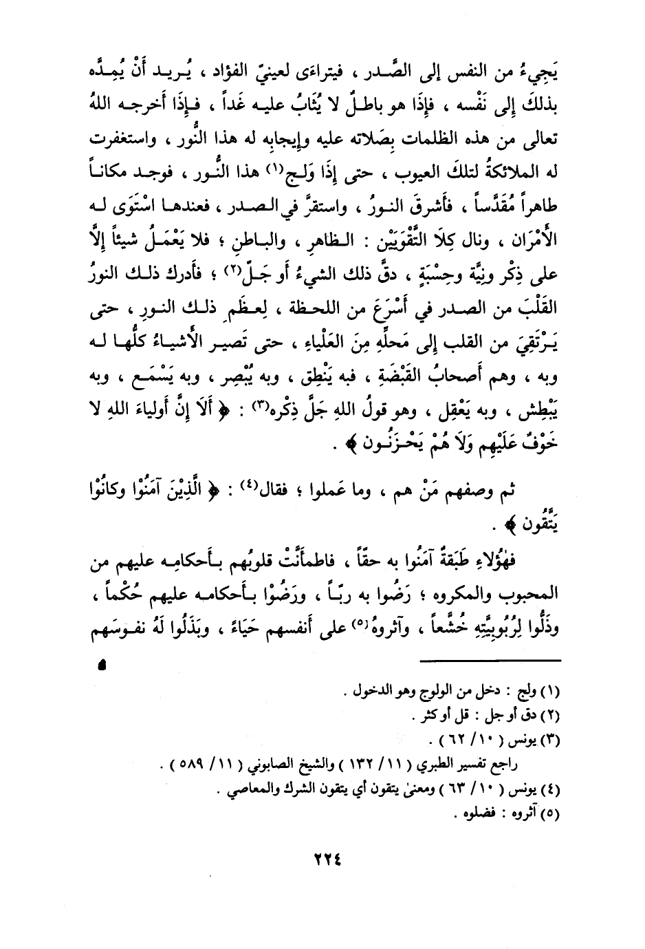 يَجِيء من النَّفس إِلَى الصَّدْر فيتراءى لعَيْنِي الْفُؤَاد يُرِيد أَن يمده بذلك إِلَى نَفسه فَإِذا هُوَ بَاطِل لَا يُثَاب عَلَيْهِ غَدا فَإِذا أخرجه الله تَعَالَى من هَذِه الظُّلُمَات بِصَلَاتِهِ عَلَيْهِ وإيجابه لَهُ هَذَا النُّور واستغفرت لَهُ الْمَلَائِكَة لتك الْعُيُوب حَتَّى إِذا ولج هَذَا النُّور فَوجدَ مَكَانا طَاهِرا مقدسا فأشرق النُّور وَاسْتقر فِي الصَّدْر فَعندهَا اسْتَوَى لَهُ الْأَمْرَانِ ونال كلا التقويين الظَّاهِر وَالْبَاطِن فَلَا يعْمل شَيْئا إِلَّا على ذكر وَنِيَّة وحسبة دق ذَلِك الشَّيْء أَو جلّ فَأدْرك ذَلِك النُّور الْقلب من الصَّدْر فِي أسْرع من اللحظة لعظم ذَلِك النُّور حَتَّى يرتقي من الْقلب إِلَى مَحَله من العلياء حَتَّى تصير الْأَشْيَاء كلهَا لَهُ وَبِه وهم أَصْحَاب القبضة فِيهِ ينْطق وَبِه يبصر وَبِه يسمع وَبِه يبطش وَبِه يعقل وَهُوَ قَول الله جلّ ذكره {أَلا إِن أَوْلِيَاء الله لَا خوف عَلَيْهِم وَلَا هم يَحْزَنُونَ}