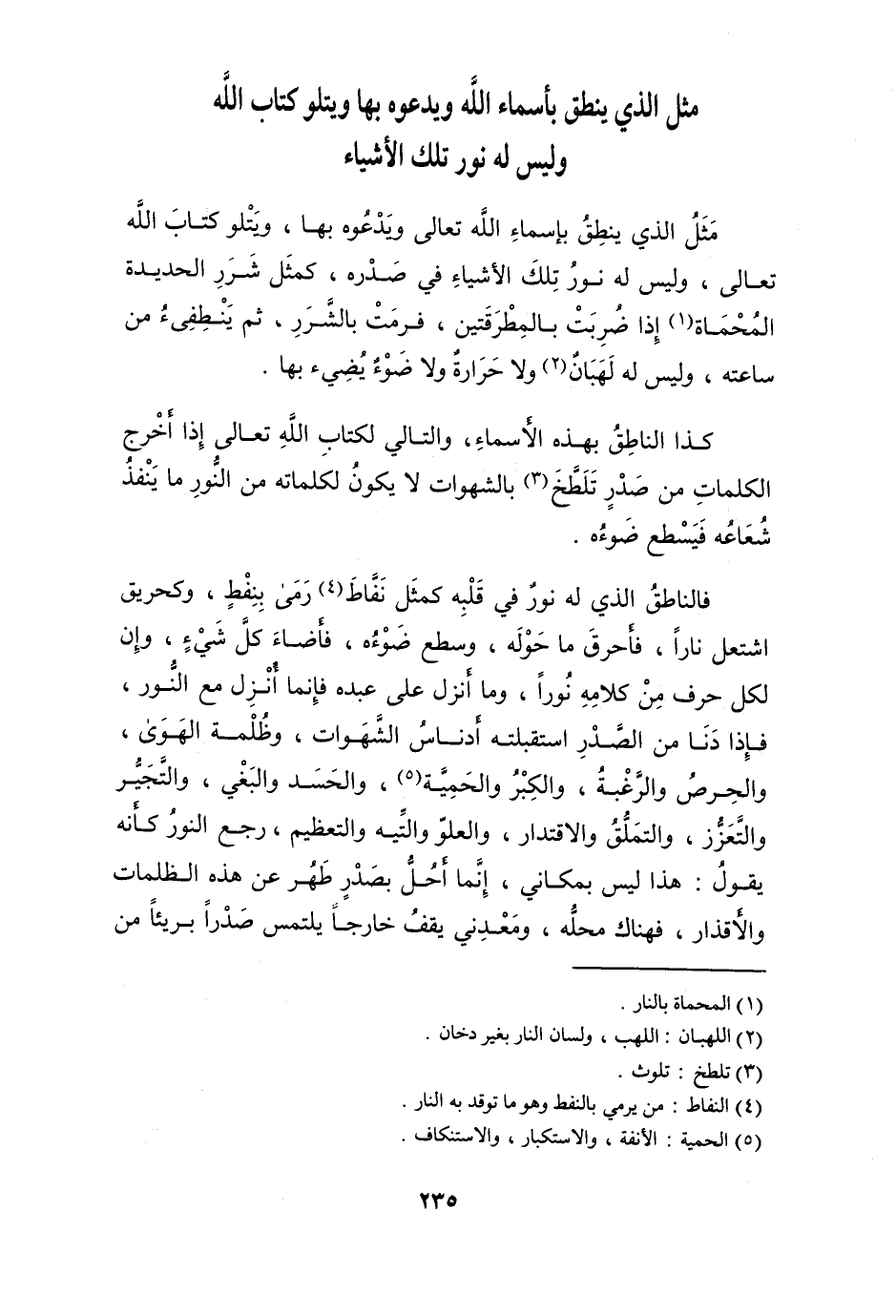 مثل الَّذِي ينْطق بأسماء الله تَعَالَى ويدعوه بهَا وَيَتْلُو كتاب الله تَعَالَى وَلَيْسَ لَهُ نور تِلْكَ الْأَشْيَاء فِي صَدره كَمثل شرر الحديدة المحماة إِذا ضربت بالمطرقتين فرمت بالشرر ثمَّ ينطفئ من سَاعَته وَلَيْسَ لَهُ لهبان وَلَا حرارة وَلَا ضوء يضيء بهَا
