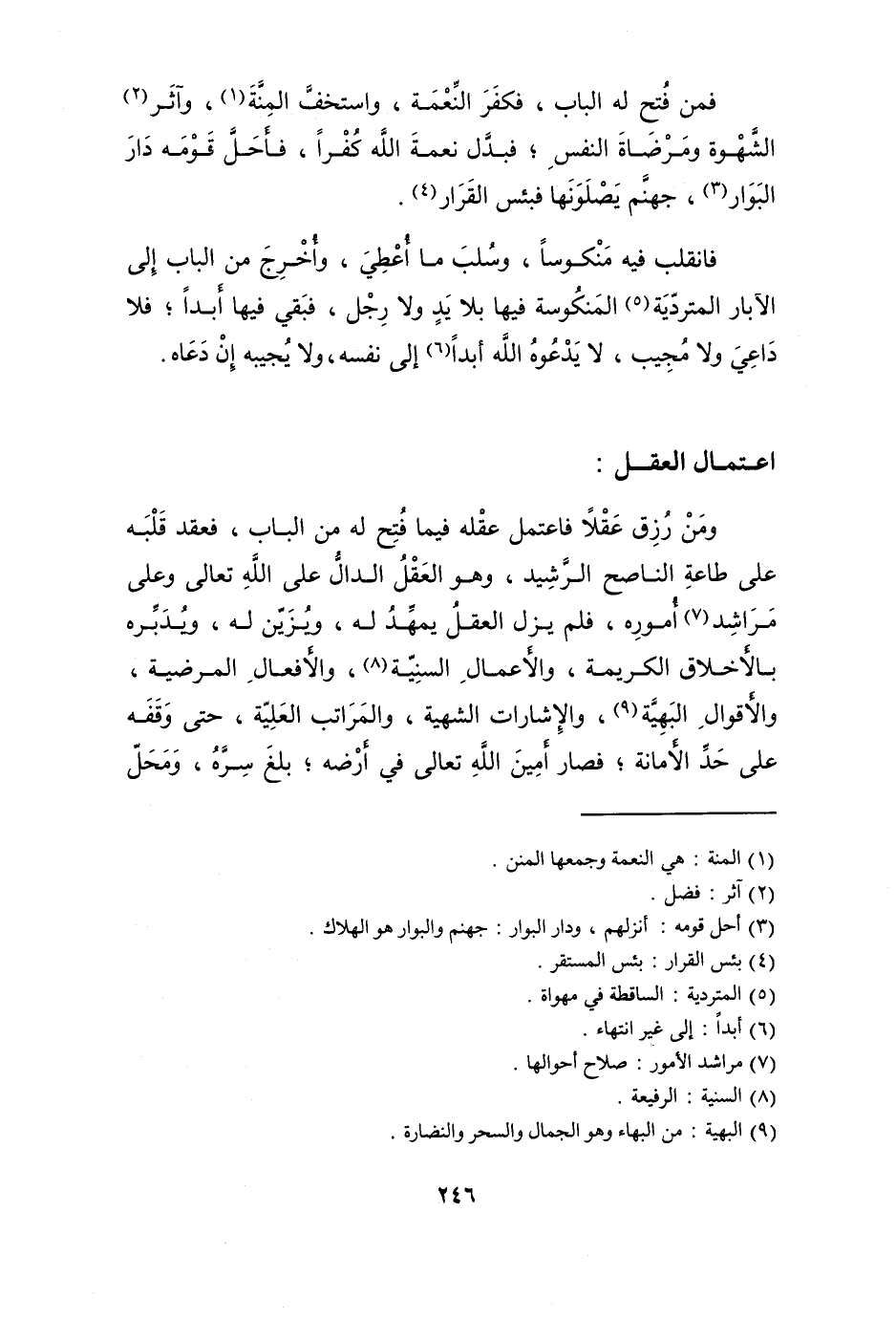 وَمن رزق عقلا فاعتمل عقله فِيمَا فتح لَهُ من الْبَاب فعقد قلبه على طَاعَة الناصح الرشيد وَهُوَ الْعقل الدَّال على الله تَعَالَى وعَلى مراشد أُمُوره فَلم يزل الْعقل يمهد لَهُ ويزين لَهُ ويدبره بالأخلاق الْكَرِيمَة والأعمال السّنيَّة وَالْأَفْعَال المرضية والأقوال البهية والإشارات الشهية والمراتب الْعلية حَتَّى وَقفه على حد الْأَمَانَة فَصَارَ أَمِين الله تَعَالَى فِي أرضه يلع سره وَمحل