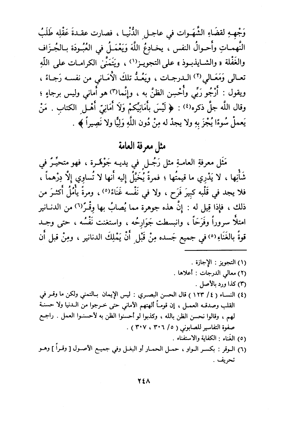مثل معرفَة الْعَامَّة مثل رجل فِي يَدَيْهِ جَوْهَرَة فَهُوَ متحير فِي شَأْنهَا لَا يدْرِي مَا قيمتهَا فَمرَّة يخيل إِلَيْهِ أَنَّهَا لَا تَسَاوِي إِلَّا درهما فَلَا يجد فِي قلبه كَبِير فَرح وَلَا فِي نَفسه غناء وَمرَّة يأمل أَكثر من ذَلِك فَإِذا قيل لَهُ إِن هَذِه جَوْهَرَة مِمَّا يصاب بهَا وقر من الدَّنَانِير امْتَلَأَ سُرُورًا وفرحا وانبسطت جوارحه واستغنت نَفسه حَتَّى وجد قُوَّة بِالْغنَاءِ فِي جَمِيع جسده من قبل أَن يملك الدَّنَانِير وَمن قبل أَن
