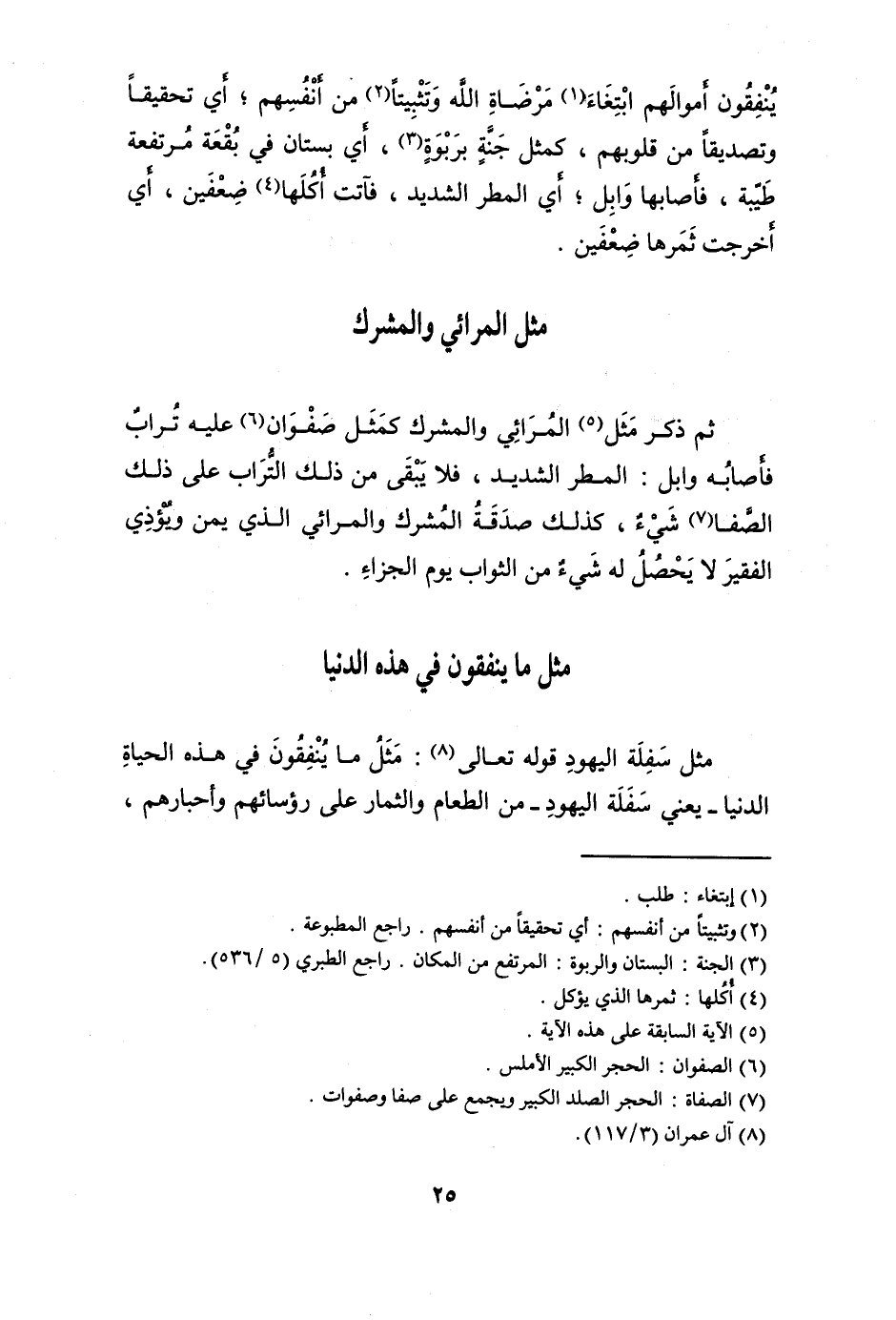 ثمَّ ذكر مثل الْمرَائِي والمشرك كَمثل صَفْوَان عَلَيْهِ تُرَاب فَأَصَابَهُ وابل الْمَطَر الشَّديد فَلَا يبْقى من ذَلِك التُّرَاب على ذَلِك الصَّفَا شَيْء كَذَلِك صَدَقَة الْمُشرك والمرائي الَّذِي يمن ويؤذي الْفَقِير لَا يحصل لَهُ شَيْء من الثَّوَاب يَوْم الْجَزَاء