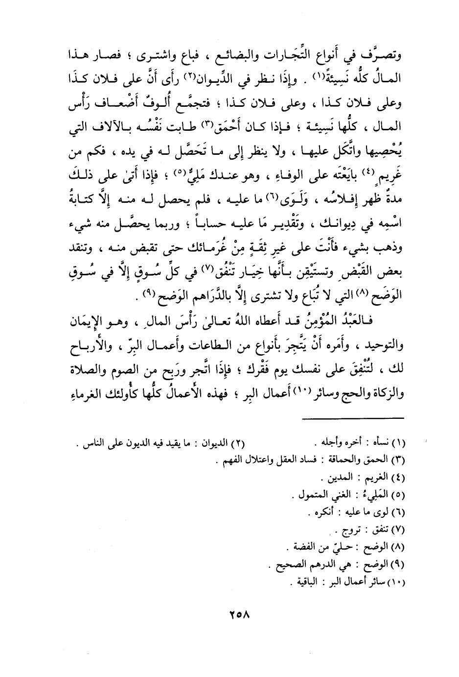 فَالْعَبْد الْمُؤمن قد أعطَاهُ الله تَعَالَى رَأس المَال وَهُوَ الْإِيمَان والتوحيد وَأمره أَن يتجر بأنواع من الطَّاعَات وأعمال الْبر والأرباح لَك لتنفق على نَفسك يَوْم فقرك فَإِذا اتّجر وَربح من الصَّوْم وَالصَّلَاة وَالزَّكَاة وَالْحج وَسَائِر أَعمال الْبر فَهَذِهِ الْأَعْمَال كلهَا كأولئك الْغُرَمَاء