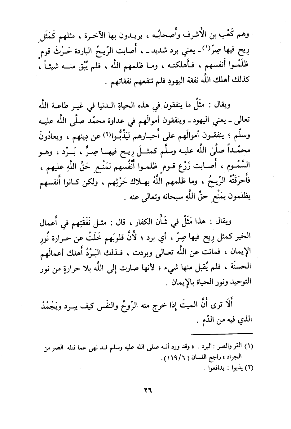 وَيُقَال هَذَا مثل فِي شَأْن الْكفَّار قَالَ مثل نَفَقَتهم فِي أَعمال الْخَيْر كَمثل ريح فِيهَا صر أَي برد لِأَن قُلُوبهم خلت عَن حرارة نور الْإِيمَان فَمَاتَتْ عَن الله تَعَالَى وَبَردت فَذَلِك الْبرد أهلك أَعْمَالهم الْحَسَنَة فَلم يقبل مِنْهَا شَيْء لِأَنَّهَا صَارَت إِلَى الله بِلَا حرارة من نور التَّوْحِيد وَنور الْحَيَاة بِالْإِيمَان