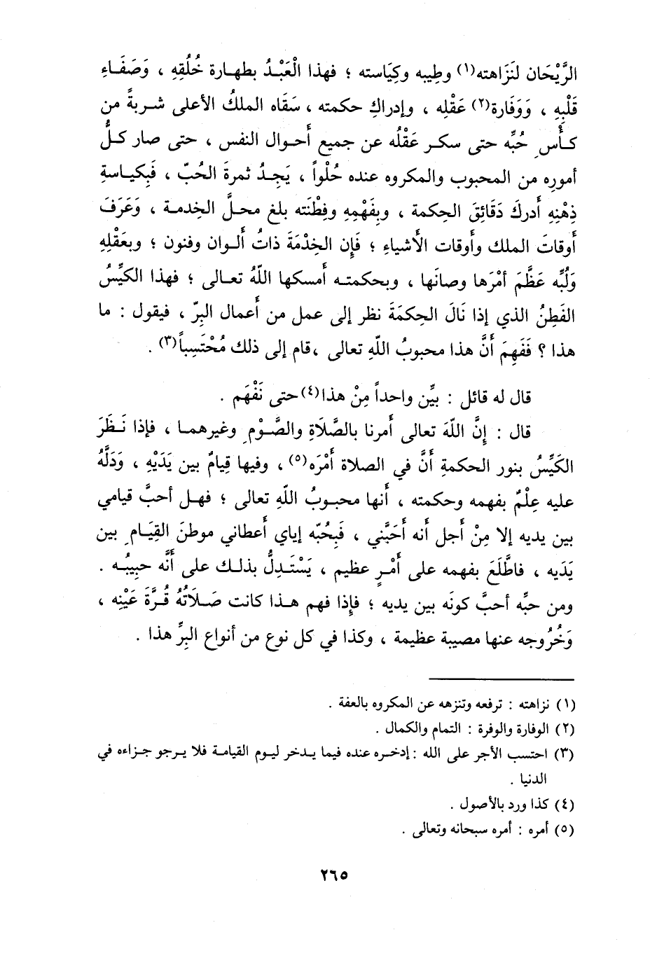 قَالَ إِن الله تَعَالَى أمرنَا بِالصَّلَاةِ وَالصَّوْم وَغَيرهمَا فَإِذا نظر الْكيس بِنور الْحِكْمَة أَن فِي الصَّلَاة أمره وفيهَا قيام بَين يَدَيْهِ ودله عَلَيْهِ علم بفهمه وحكمته أَنَّهَا مَحْبُوب الله تَعَالَى فَهَل أحب قيامي بَين يَدَيْهِ إِلَّا من أجل أَنه أَحبَّنِي فبحبه إيَّايَ أَعْطَانِي موطن الْقيام بَين يَدَيْهِ فَاطلع بفهمه على أَمر عَظِيم يسْتَدلّ بذلك على أَنه حَبِيبه وَمن حبه أحب كَونه بَين يَدَيْهِ فَإِذا فهم هَذَا كَانَت صلَاته قُرَّة عينه وَخُرُوجه عَنْهَا مُصِيبَة عَظِيمَة وَكَذَا فِي كل نوع من أَنْوَاع الْبر هَذَا