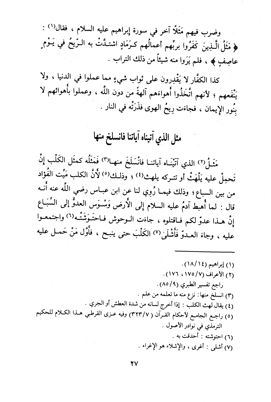(مثل الَّذِي آتيناه آيَاتنَا فانسلخ مِنْهَا فَمثله كَمثل الْكَلْب إِن تحمل عَلَيْهِ يَلْهَث أَو تتركه يَلْهَث) وَذَلِكَ لِأَن الْكَلْب ميت الْفُؤَاد من بَين السبَاع وَذَلِكَ فِيمَا رُوِيَ لنا عَن ابْن عَبَّاس رَضِي الله عَنهُ أَنه قَالَ لما أهبط آدم عَلَيْهِ السَّلَام إِلَى الأَرْض وسوس الْعَدو إِلَى السبَاع إِن هَذَا عَدو لكم فَاقْتُلُوهُ جَاءَت الوحوش فاحتوشته واجتمعوا عَلَيْهِ وَجَاء الْعَدو فأشلى الْكَلْب حَتَّى ينبح فَأول من حمل عَلَيْهِ