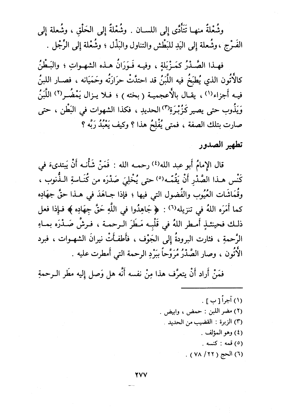 قَالَ الإِمَام أَبُو عبد الله رَحمَه الله فَمن شائه أَن يَبْتَدِئ فِي كنس هَذَا الصَّدْر أَن يقمه حَتَّى يخلي صَدره من كناسَة الذُّنُوب وقماشات الْعُيُوب والفضول الَّتِي فِيهَا فَإِذا جَاهد فِي هَذَا حق جهاده كَمَا أمره الله فِي تَنْزِيله {وَجَاهدُوا فِي الله حق جهاده} فَإِذا فعل ذَلِك فَحِينَئِذٍ أمطر الله فِي قلبه مطر الرَّحْمَة فرش صَدره بِمَاء الرَّحْمَة فثارت الْبُرُودَة إِلَى الْجوف فأطفأت نيران الشَّهَوَات فبرد الأتون وَصَارَ الصَّدْر مروحا بِبرد الرَّحْمَة الَّتِي أمْطرت عَلَيْهِ